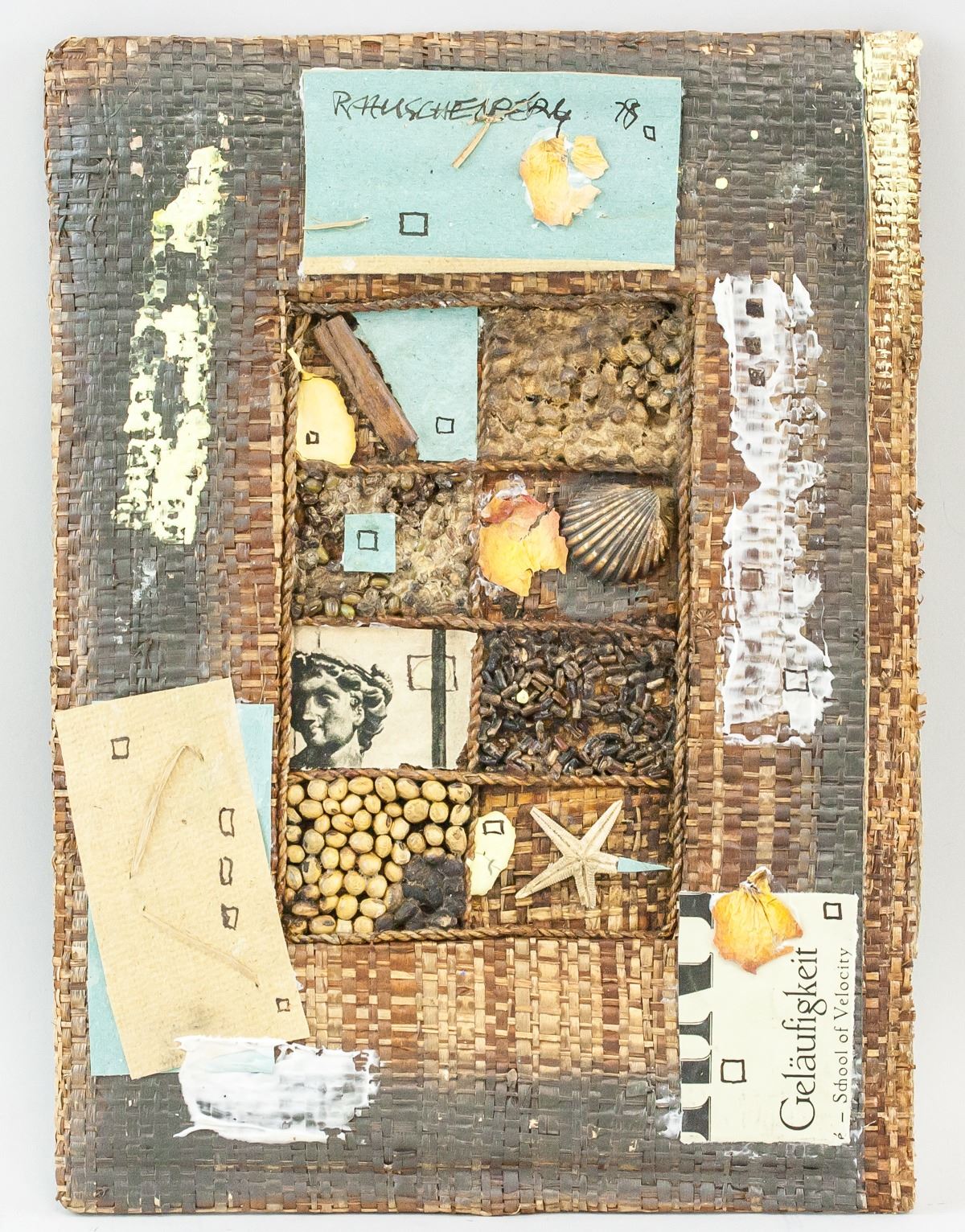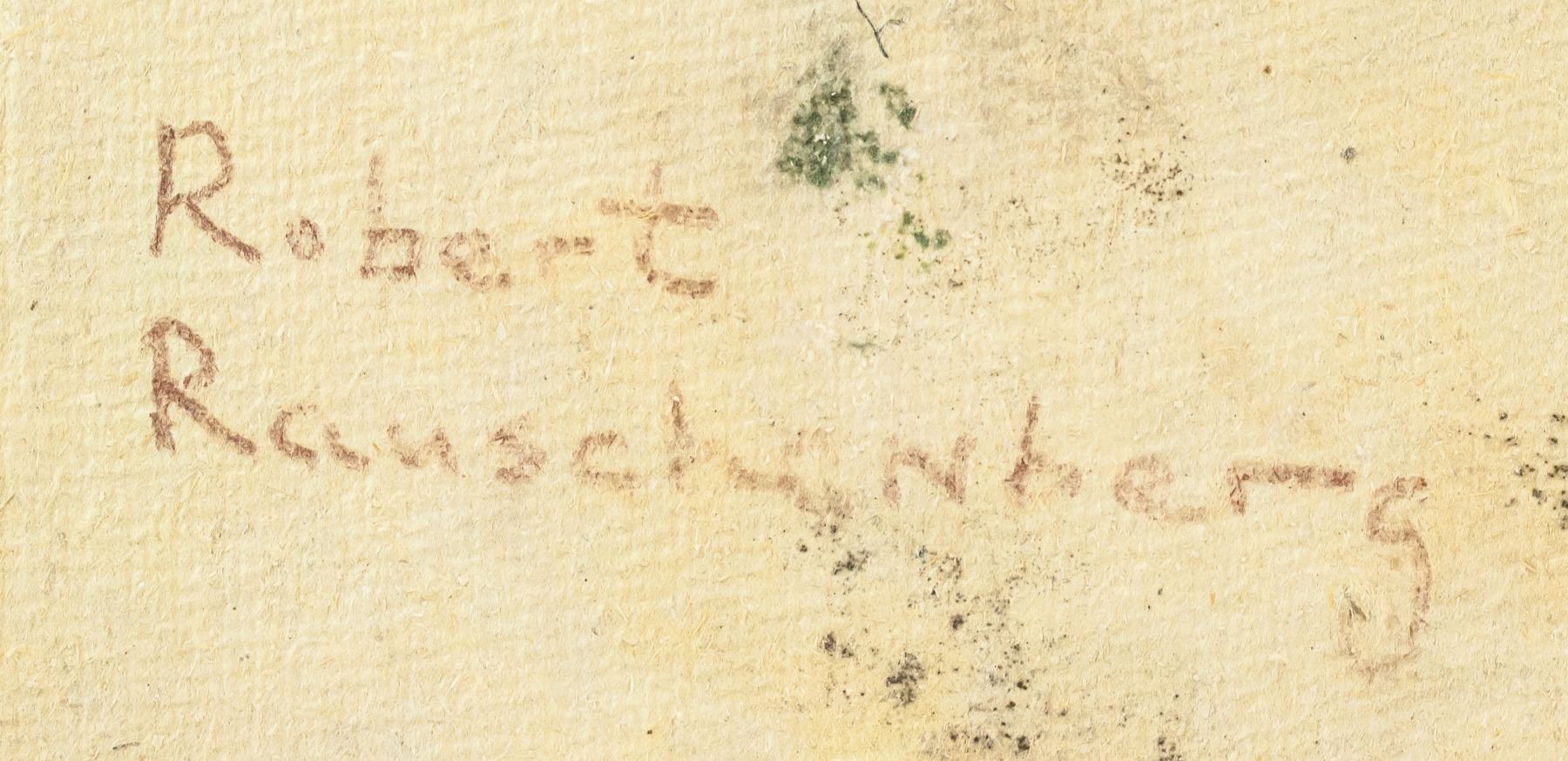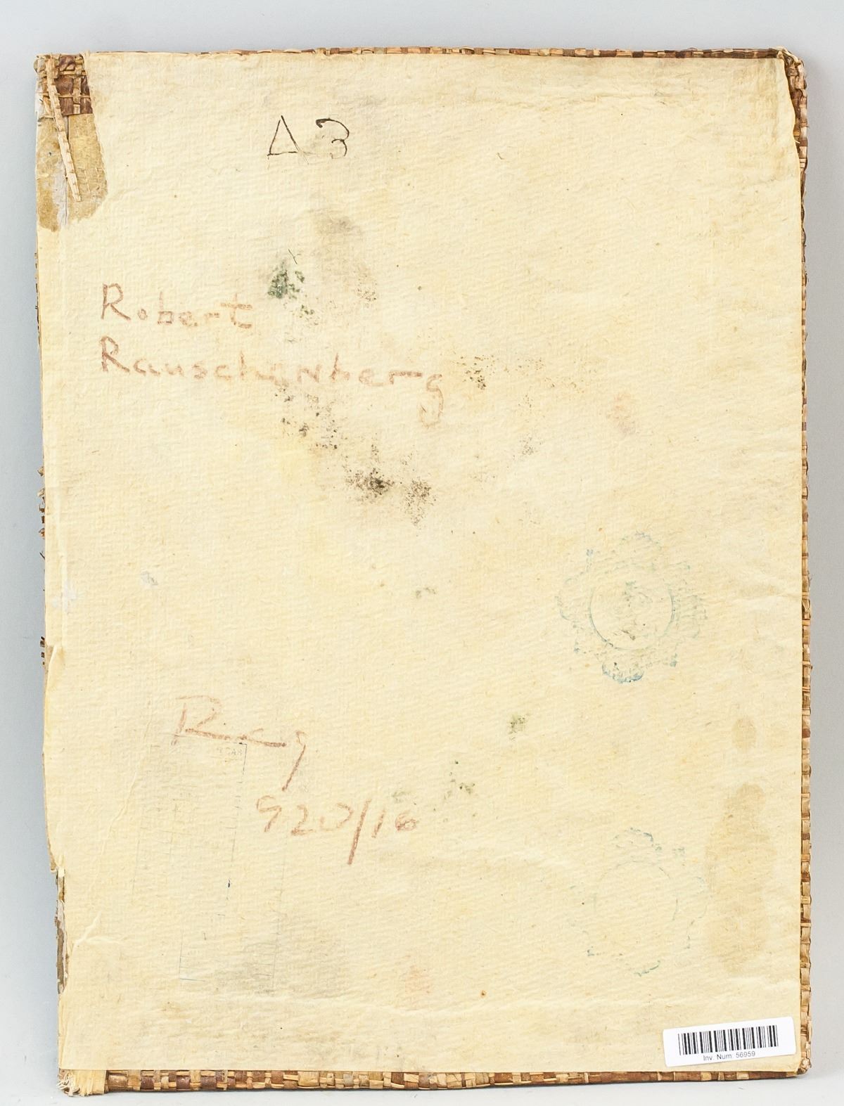 Mixed media on board. Featuring collage of shells, beads, and other materials. Signed "Rauschenberg" to the top. "Robert Rauschenberg" inscribed on verso. "920/16" inscribed on verso. Illegible blue stamp on verso. Attributed to Robert Rauschenberg (1925-2008, American). 35 x 26 cm (13.75 x 10 inches).