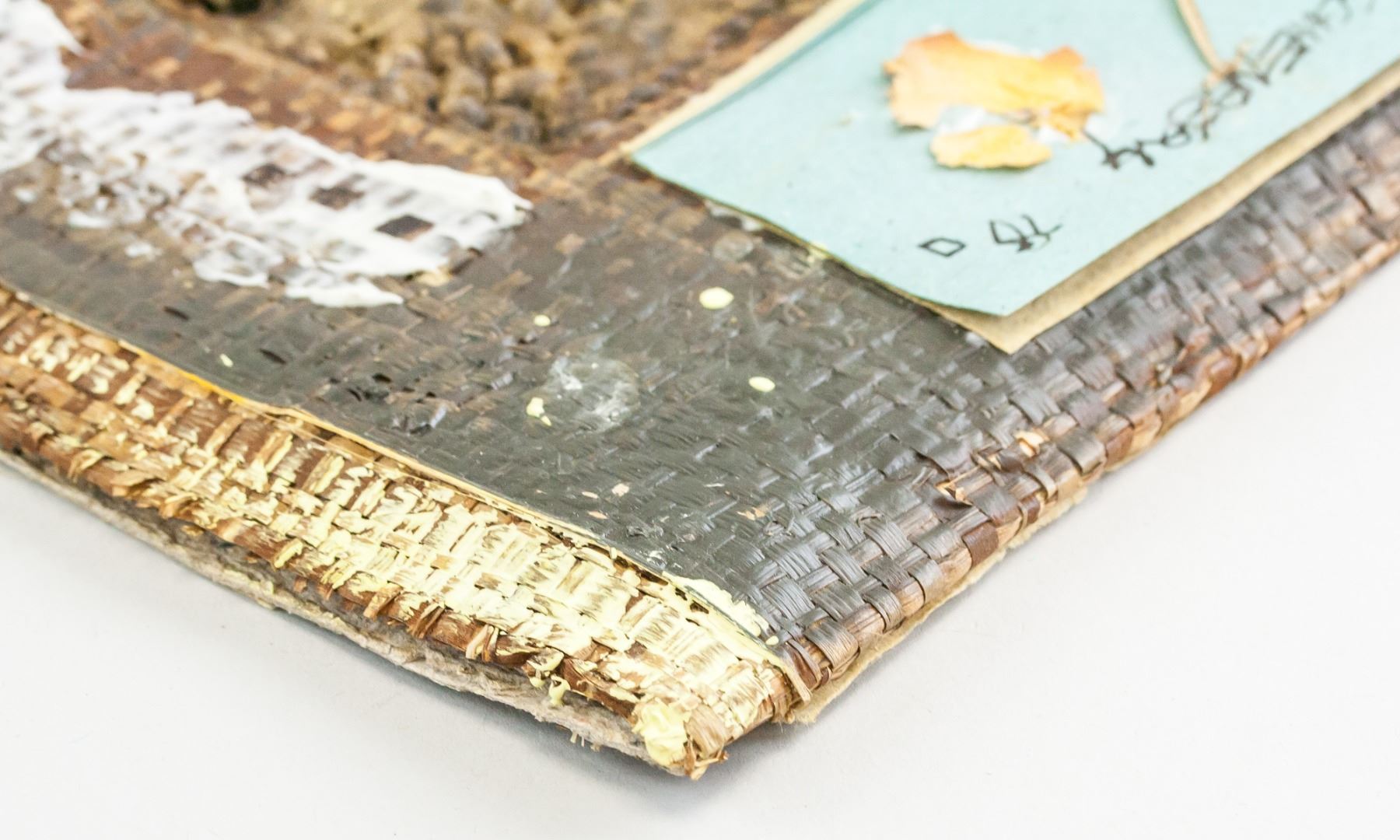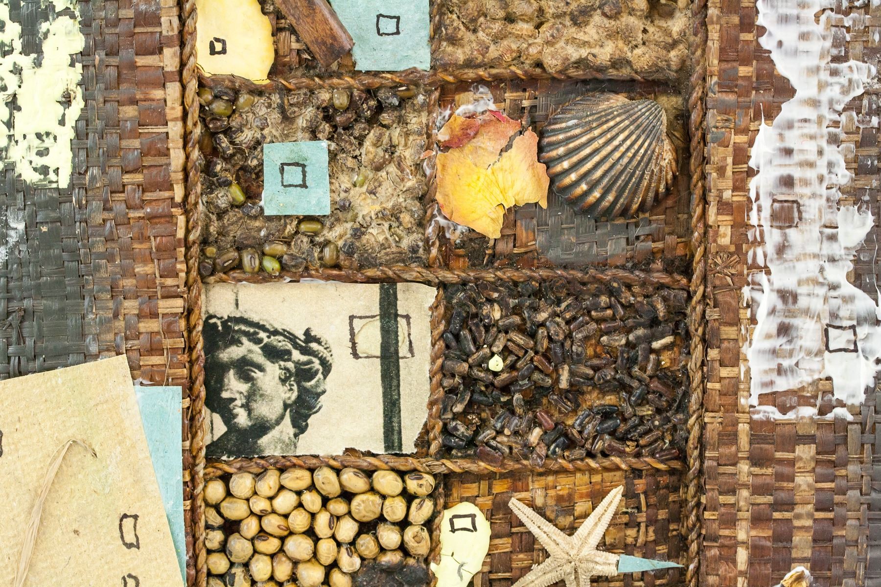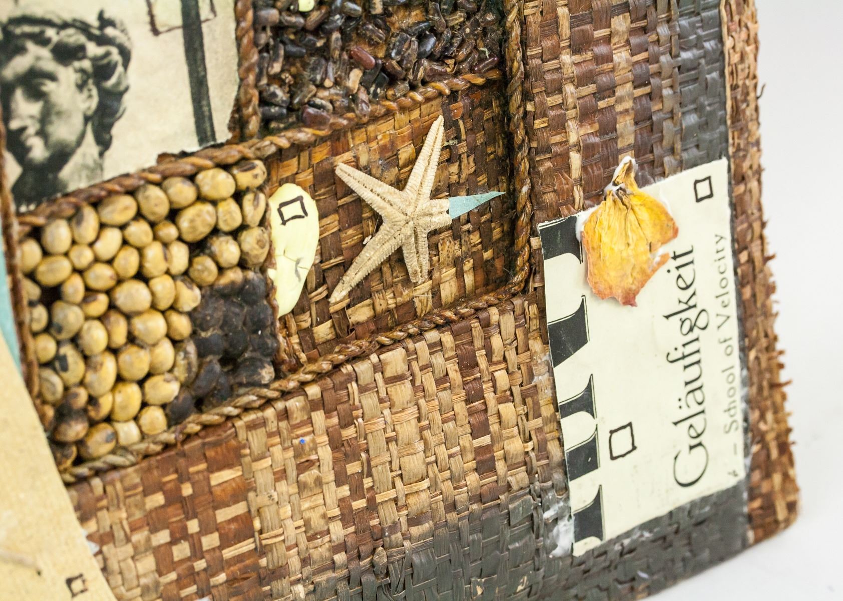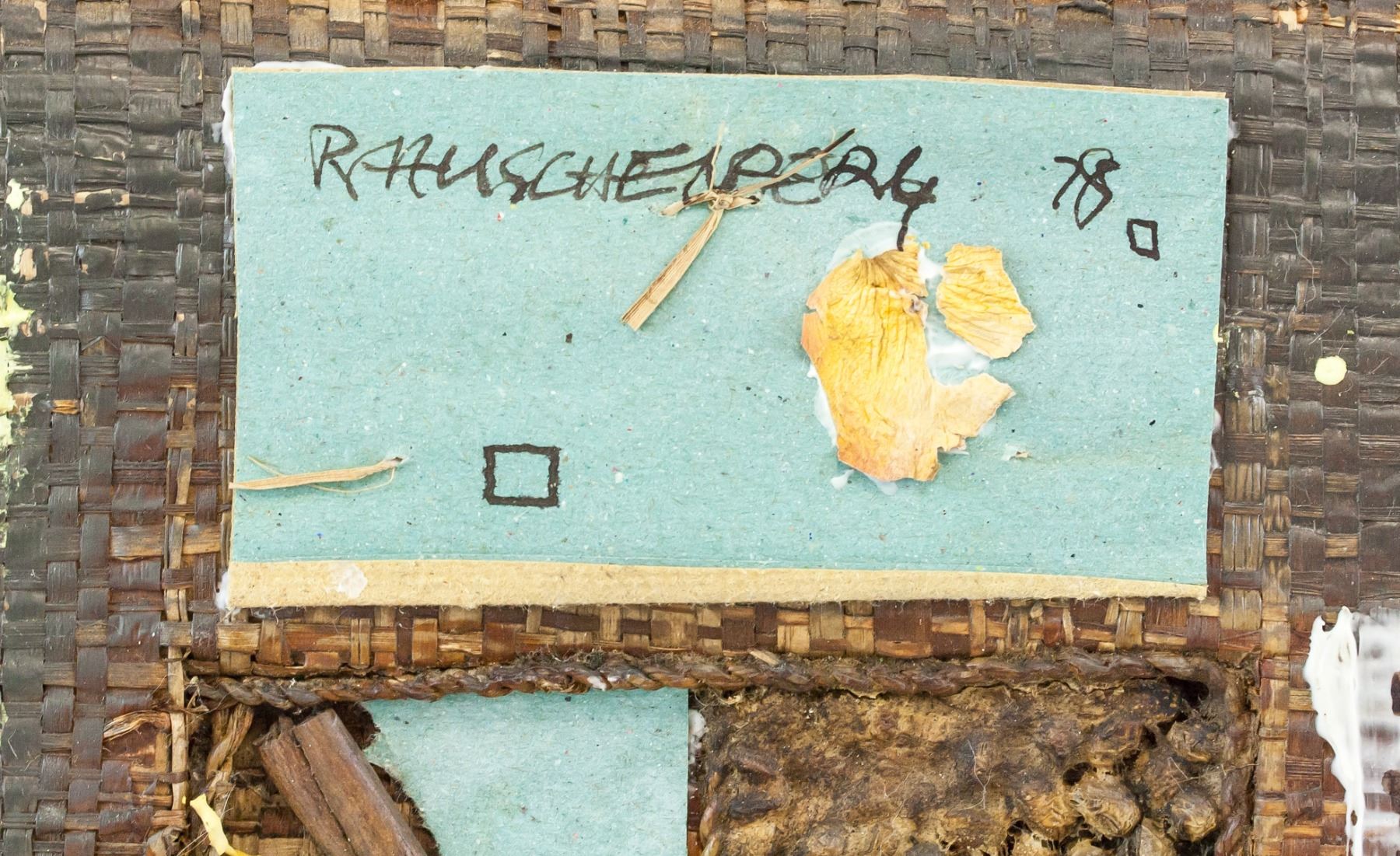 Mixed media on board. Featuring collage of shells, beads, and other materials. Signed "Rauschenberg" to the top. "Robert Rauschenberg" inscribed on verso. "920/16" inscribed on verso. Illegible blue stamp on verso. Attributed to Robert Rauschenberg (1925-2008, American). 35 x 26 cm (13.75 x 10 inches).