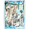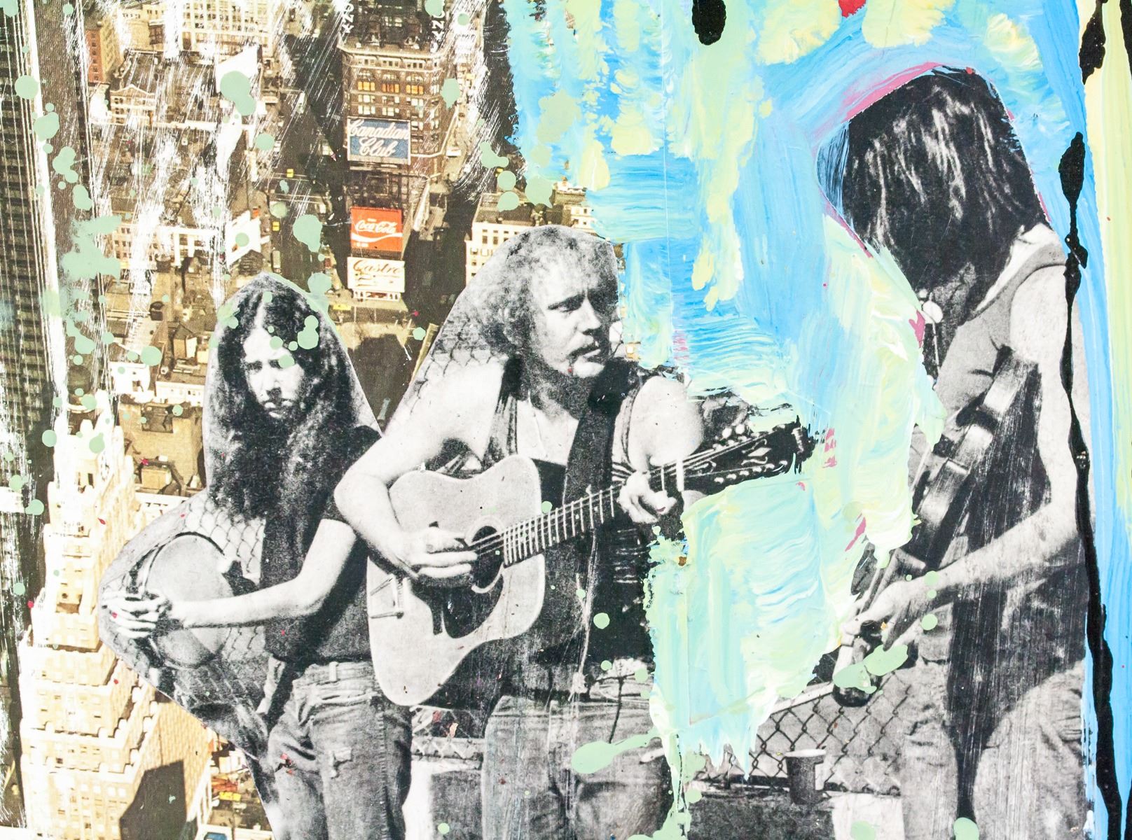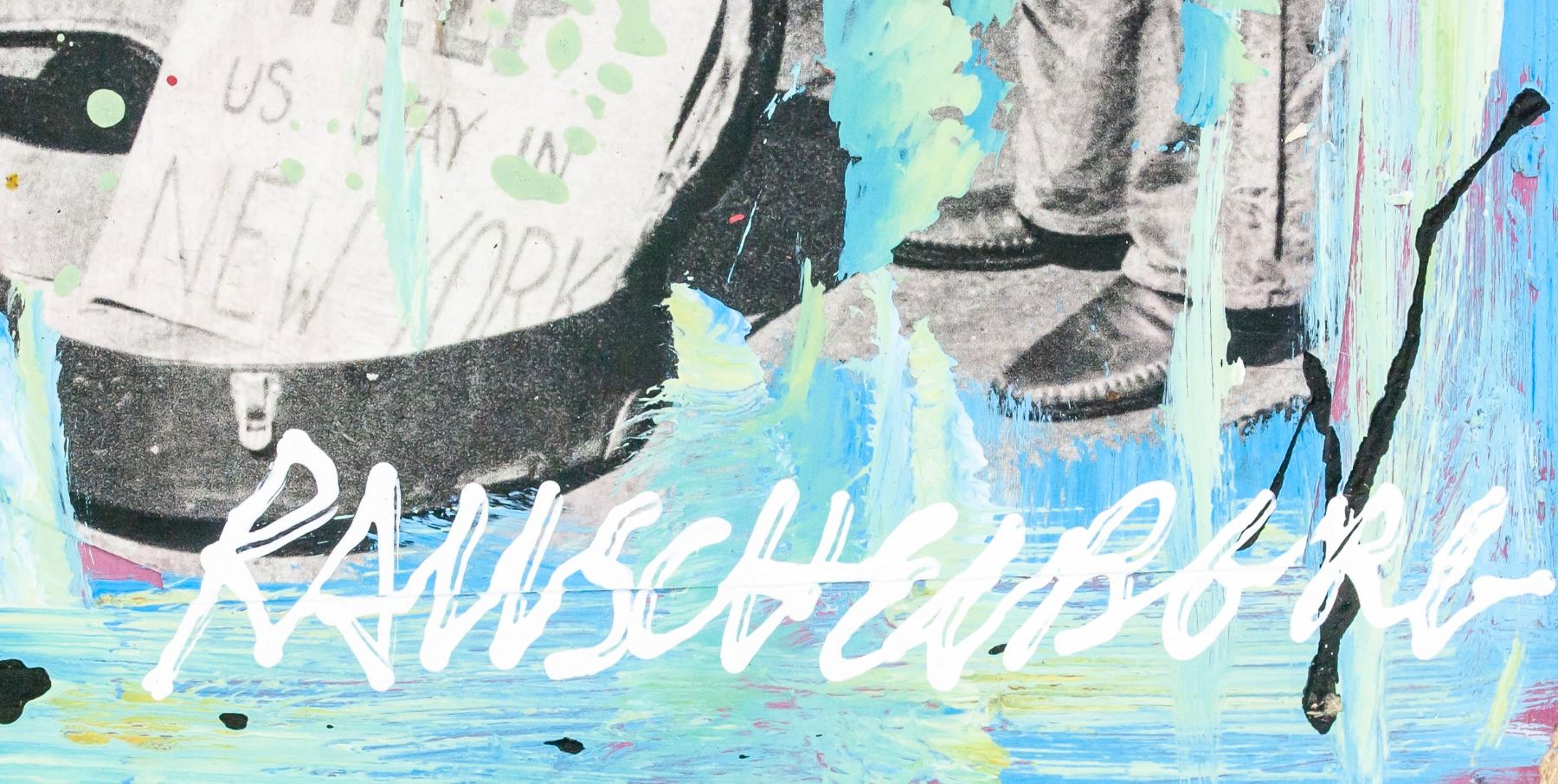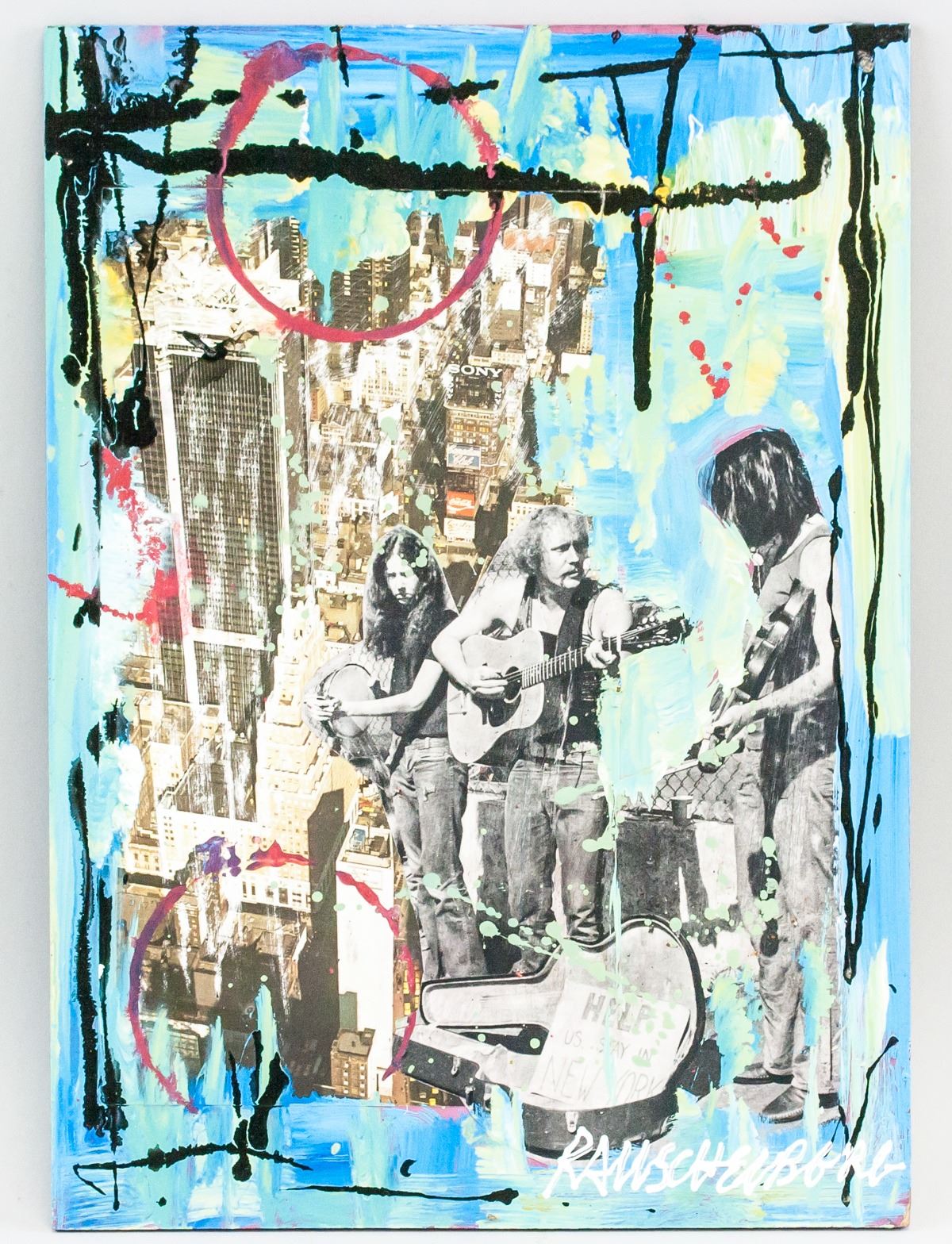 Mixed media collage on panel. Featuring three people playing instruments with a cityscape behind them. Both backdropped by a yellow and blue background. Signed "RAUSCHENBERG" in the bottom right corner. Attributed to Robert Rauschenberg (1925-2008, American). 34.5 x 20 cm (13.5 x 10 inches). Provenance: this lot carries limited provenance from an Upper New York estate.