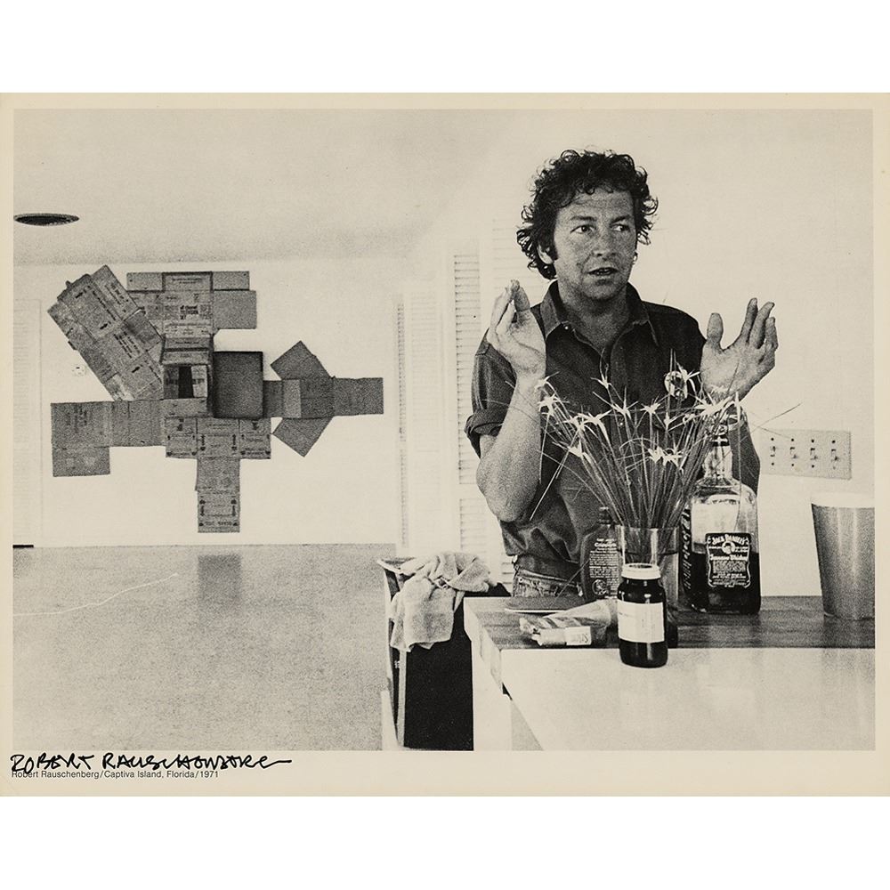 Uncommon oversized 13.75 x 11 print of Rauschenberg in his studio on Captiva Island in 1971, signed in the lower border in black felt tip. In fine to very fine condition, with a small crease to the lower left corner tip.