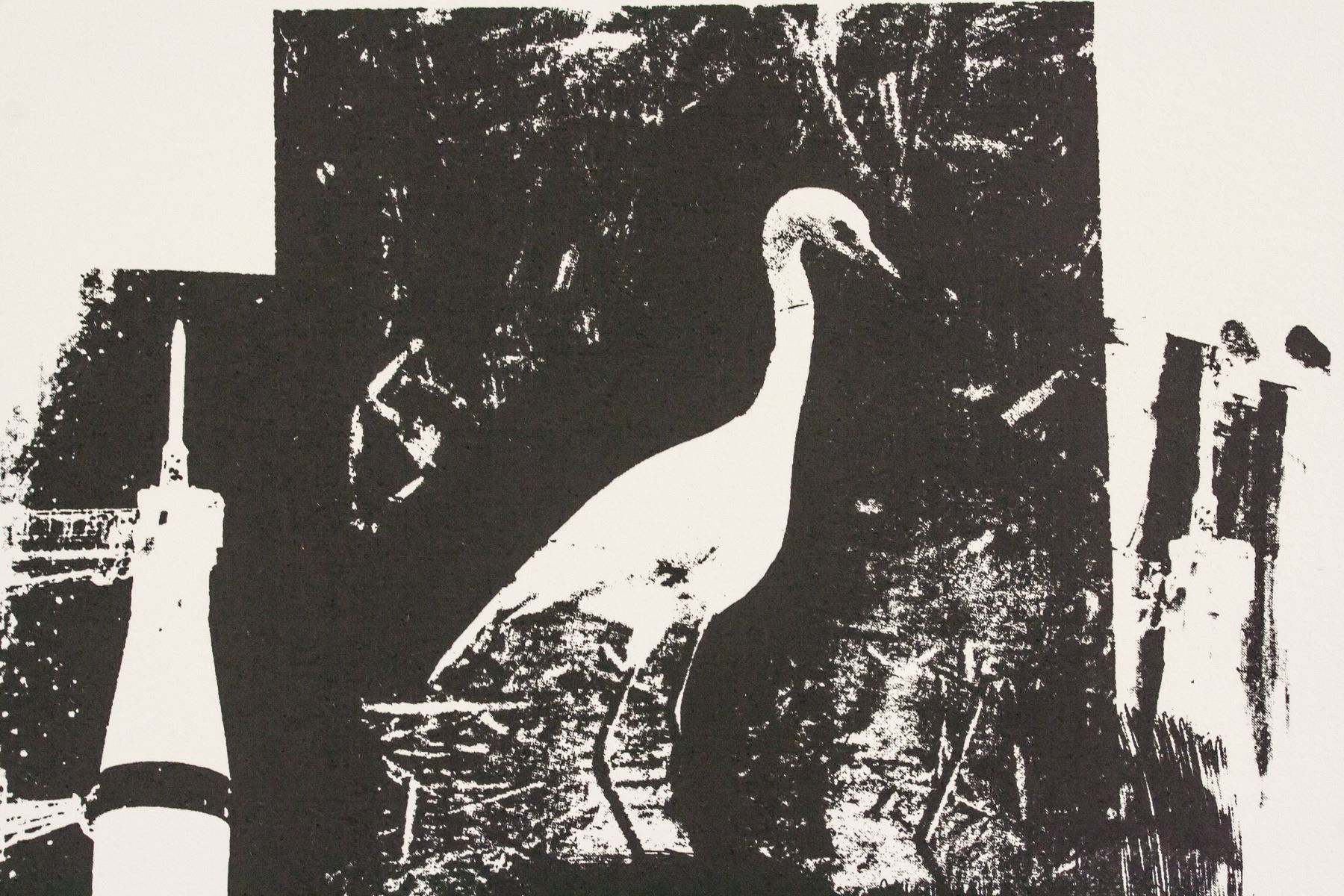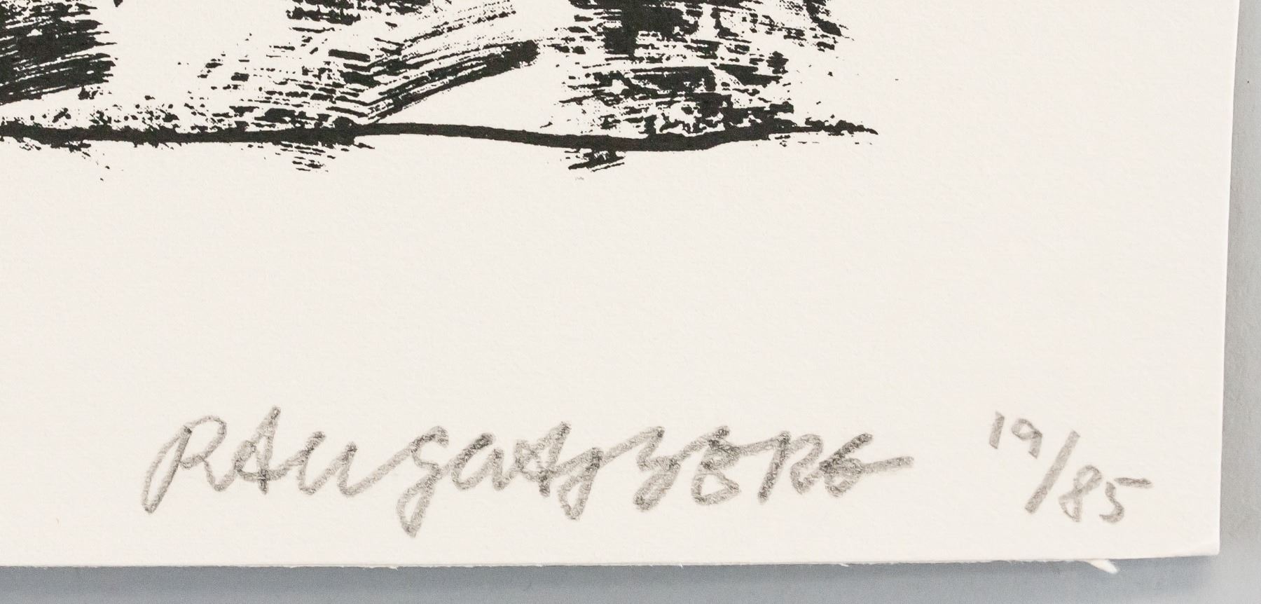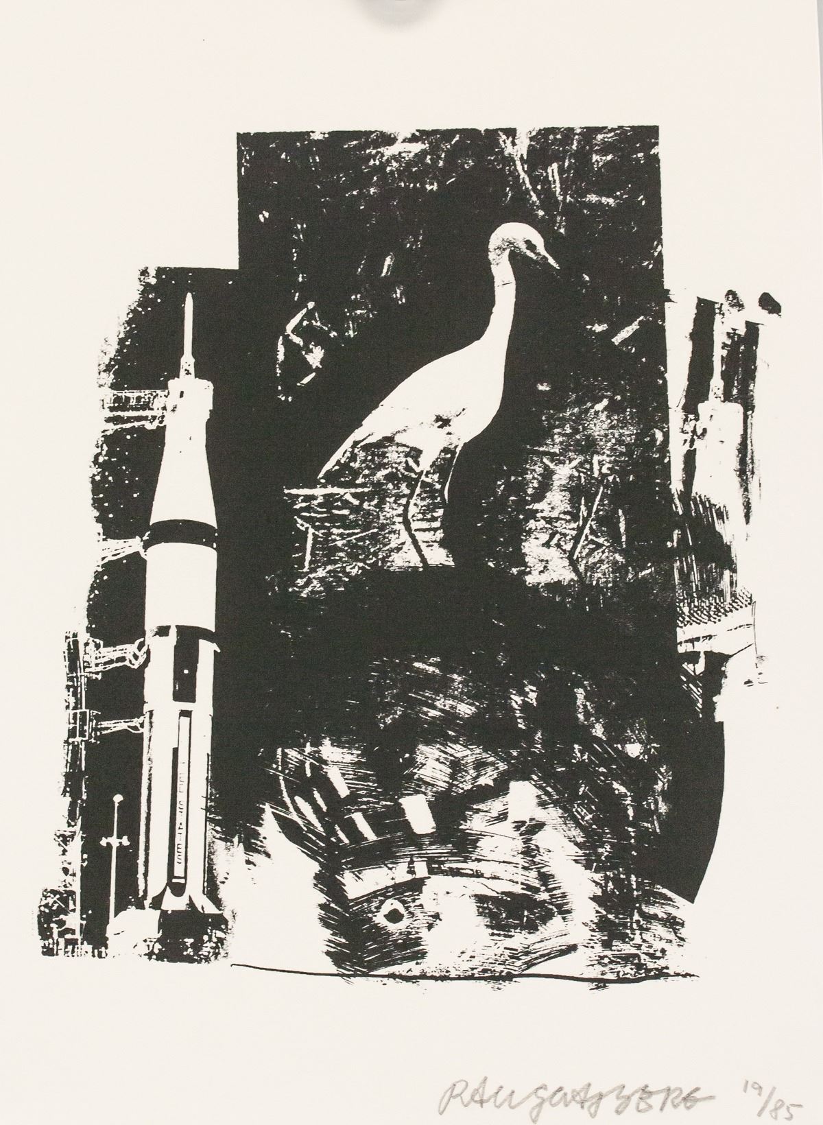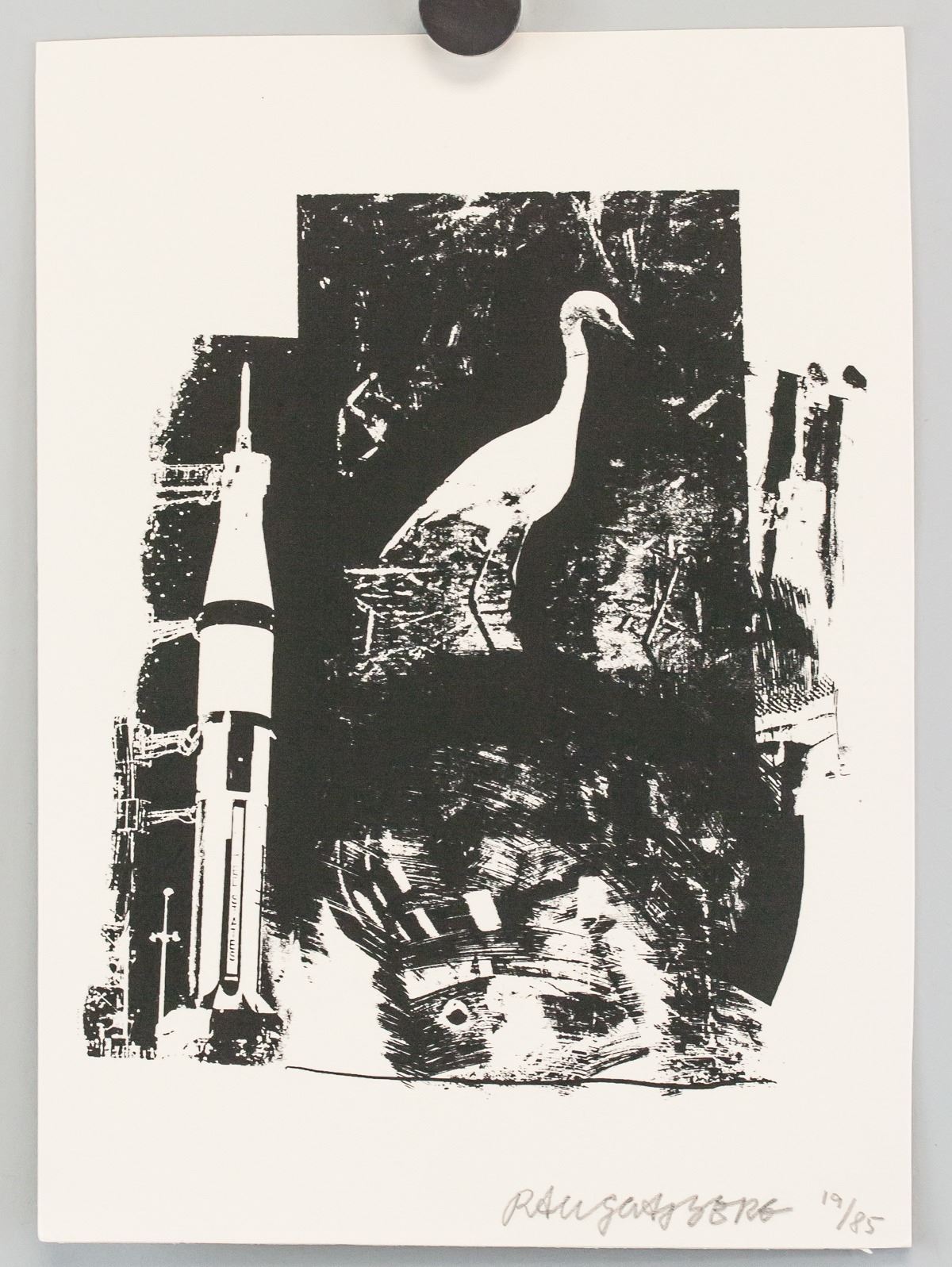 Silkscreen on paper. Featuring black and white collage images of a bird and a rocket. Signed "RAUSCHENBERG" in the bottom right corner. "19/85" inscribed beside the signature. "No 78" inscribed on verso. "Harper Publishing" stamped on verso. Attributed to Robert Rauschenberg (1925-2008, American). 29 x 21 cm (11.5 x 8.25). Provenance: This lot carries limited provenance from a Southern Ontario estate
