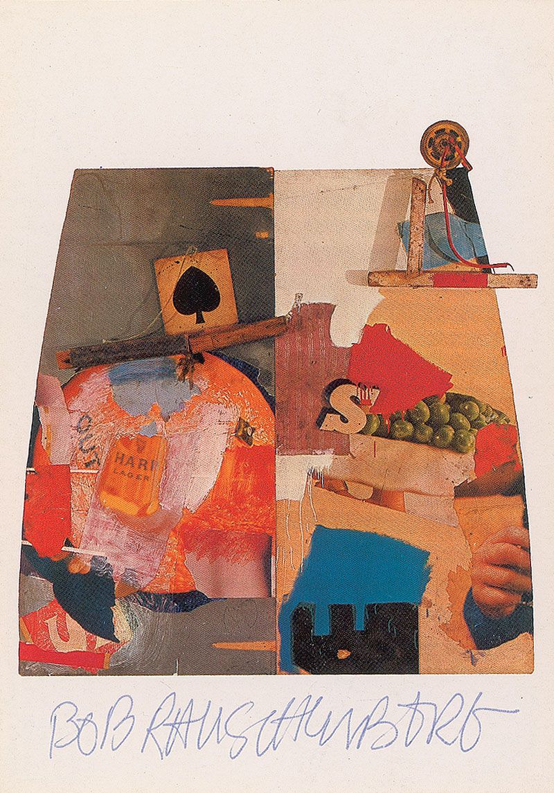 Color postcard of Rauschenberg’s 1964 work entitled ‘Story,’ 4 x 5.75, signed along the bottom in blue ballpoint, “Bob Rauschenberg.” In fine condition.