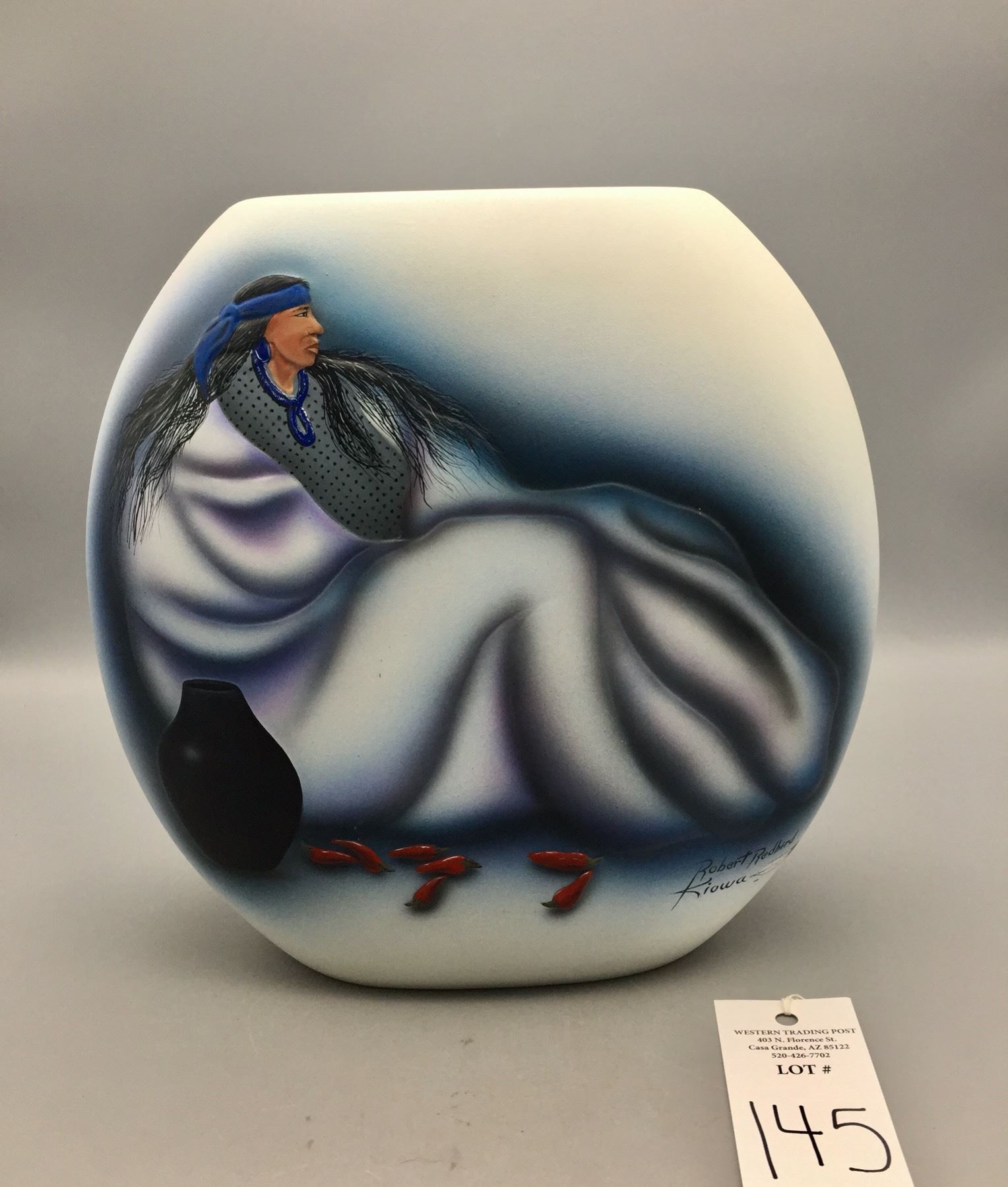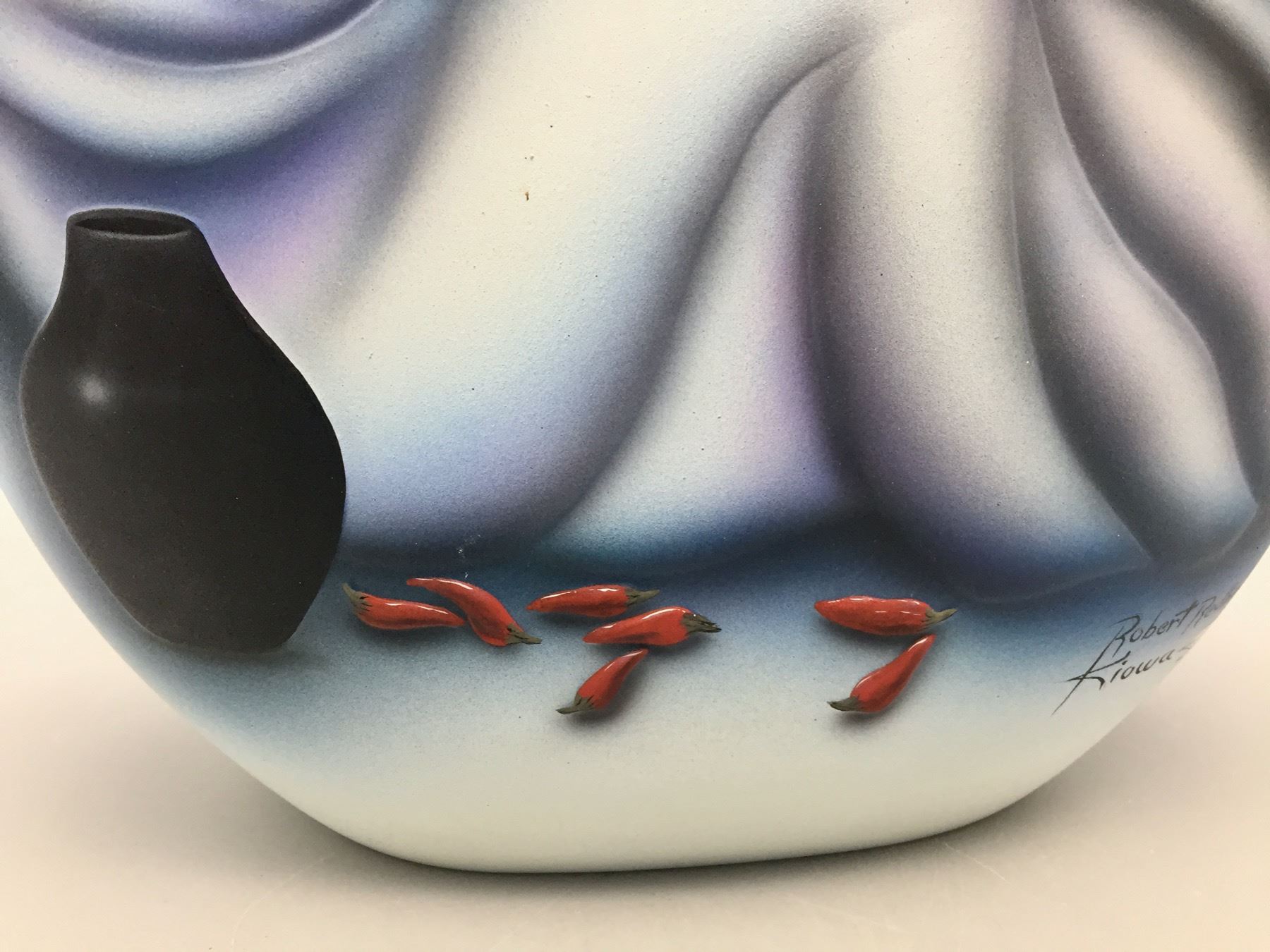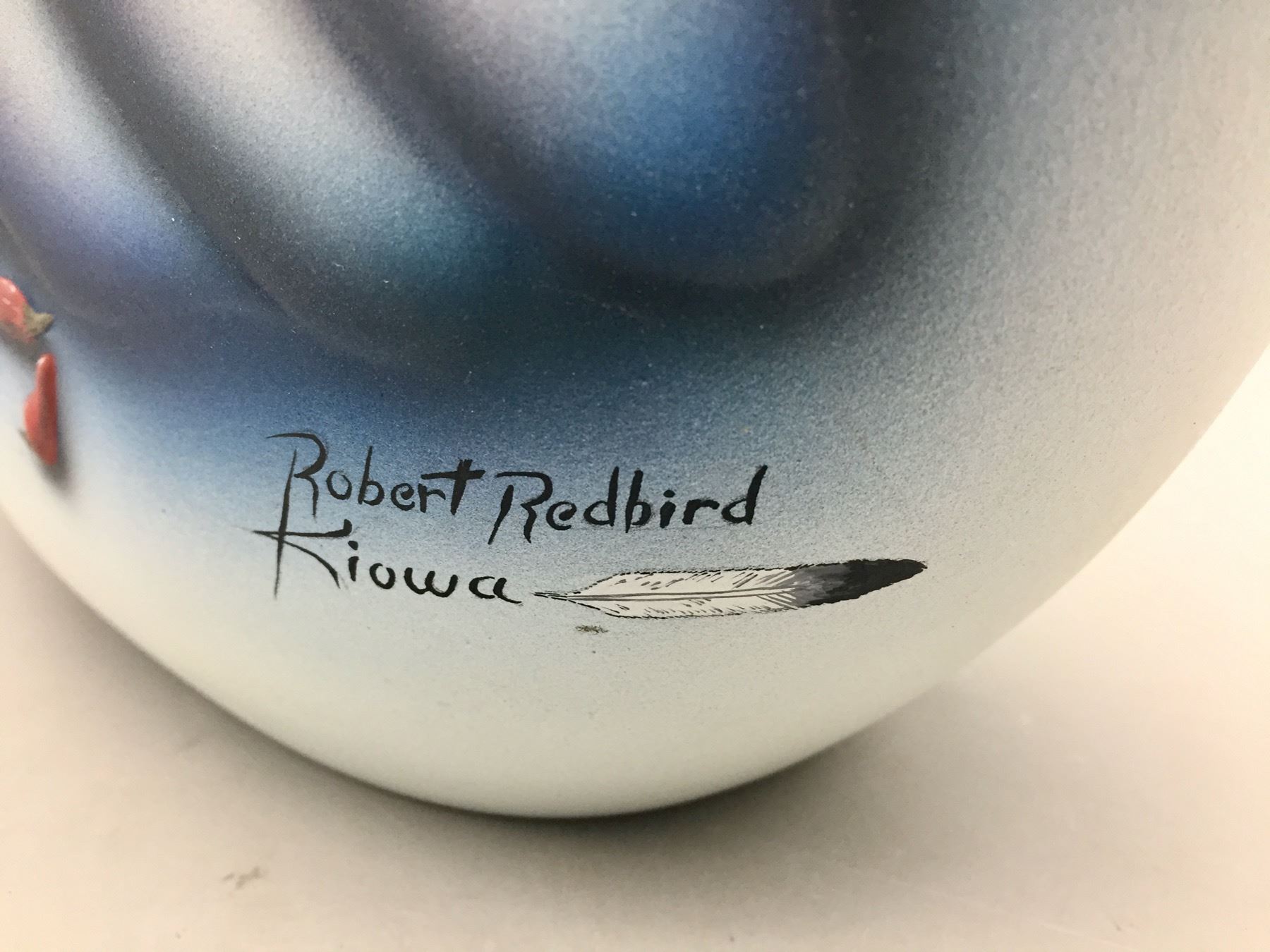 Description: For sale in this lot is a beautifully hand painted pot by the well-known artist, Robert Redbird. It features a traditional looking Robert Redbird scene. Maker: Robert Redbird, Kiowa (1939-2016). Approx. Age: Vintage. Size: Measures 11-1/2 inches wide x 12 inches tall. Condition: Good for its age, normal wear expected. Please look closely at the pictures - they are an important part of our description. Shipping: There will be a $10 handling, packaging fee for shipping this lot. The actual cost of postage will be added on top of that.