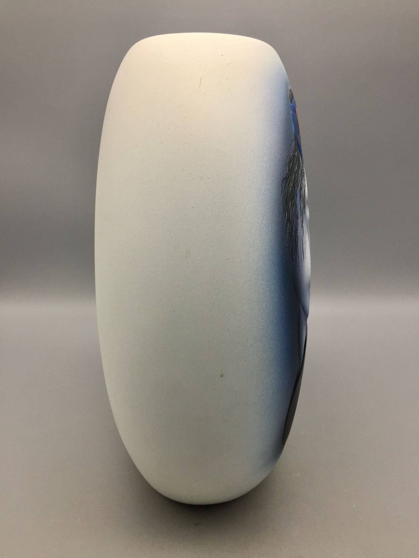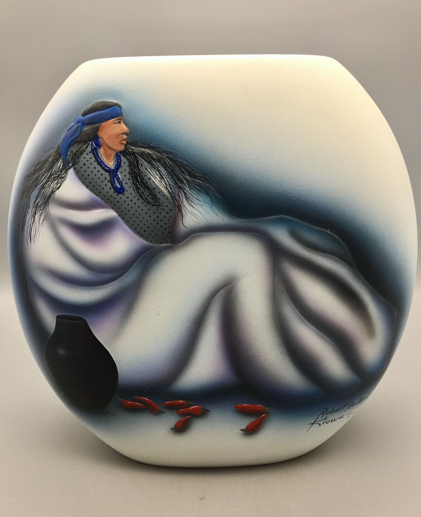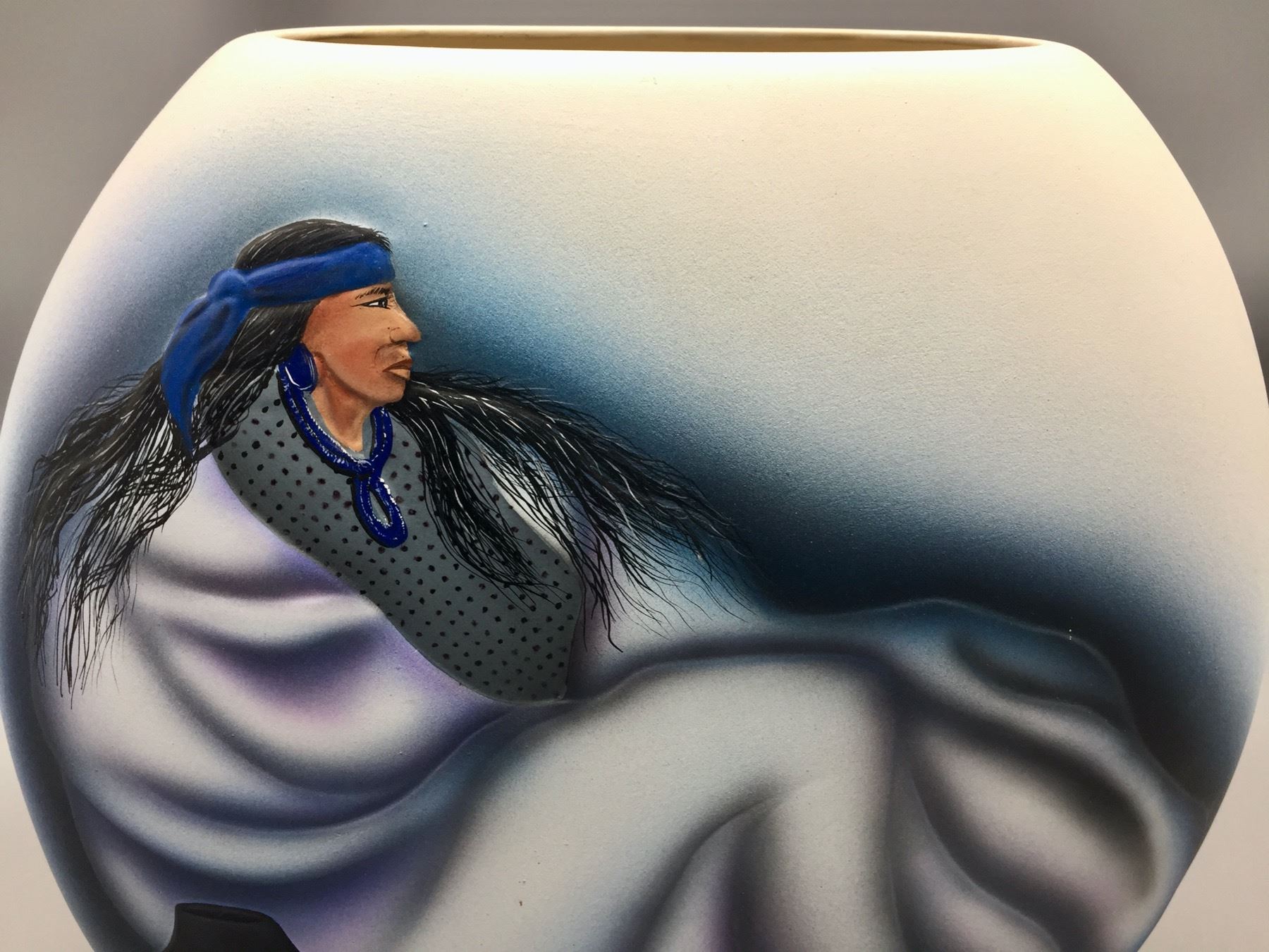 Description: For sale in this lot is a beautifully hand painted pot by the well-known artist, Robert Redbird. It features a traditional looking Robert Redbird scene. Maker: Robert Redbird, Kiowa (1939-2016). Approx. Age: Vintage. Size: Measures 11-1/2 inches wide x 12 inches tall. Condition: Good for its age, normal wear expected. Please look closely at the pictures - they are an important part of our description. Shipping: There will be a $10 handling, packaging fee for shipping this lot. The actual cost of postage will be added on top of that.