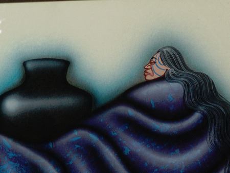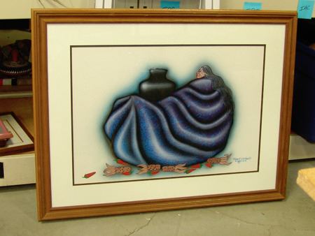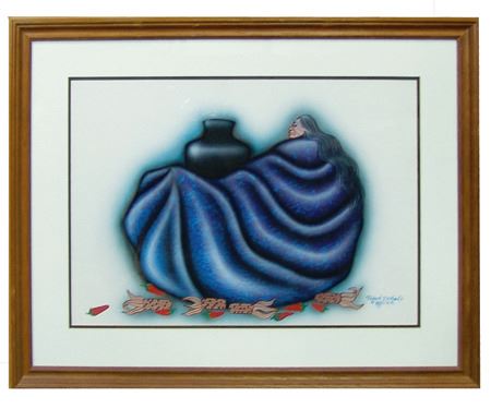 Late 1900s, Large signed original gouache on paper depicting a seated robed figure with large black pottery jar. Very good condition. 19" x 28" (30" x 38" framed)