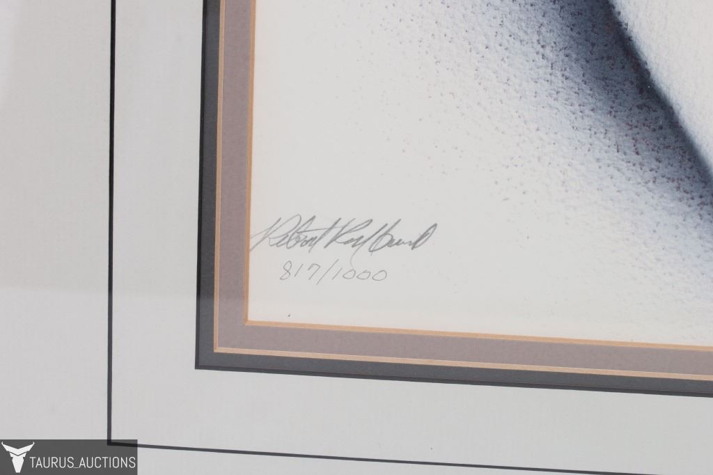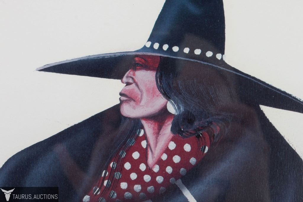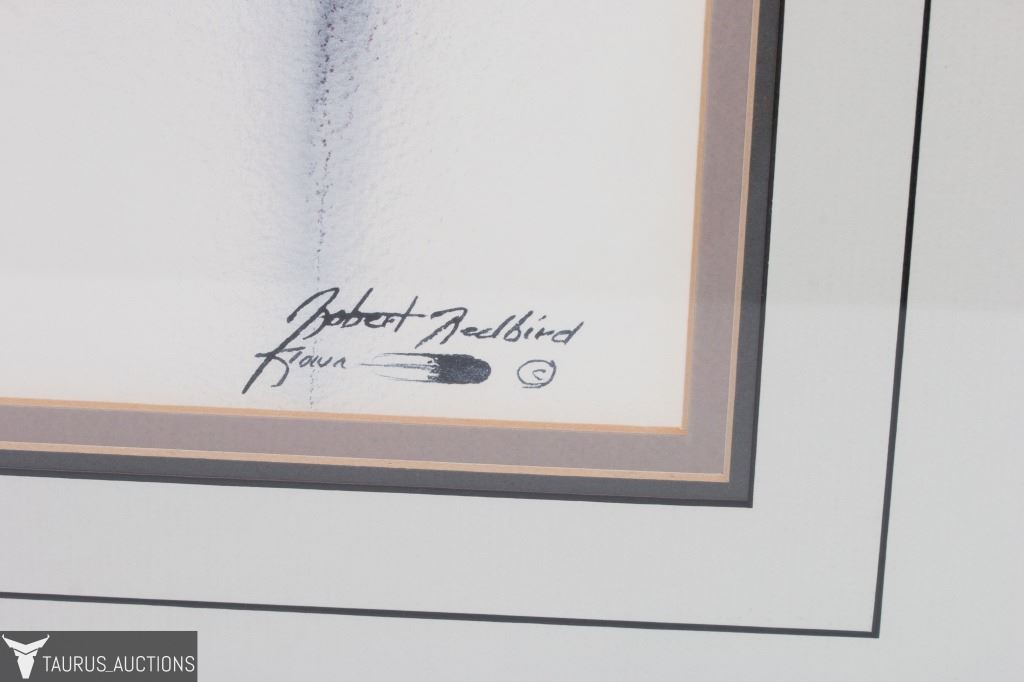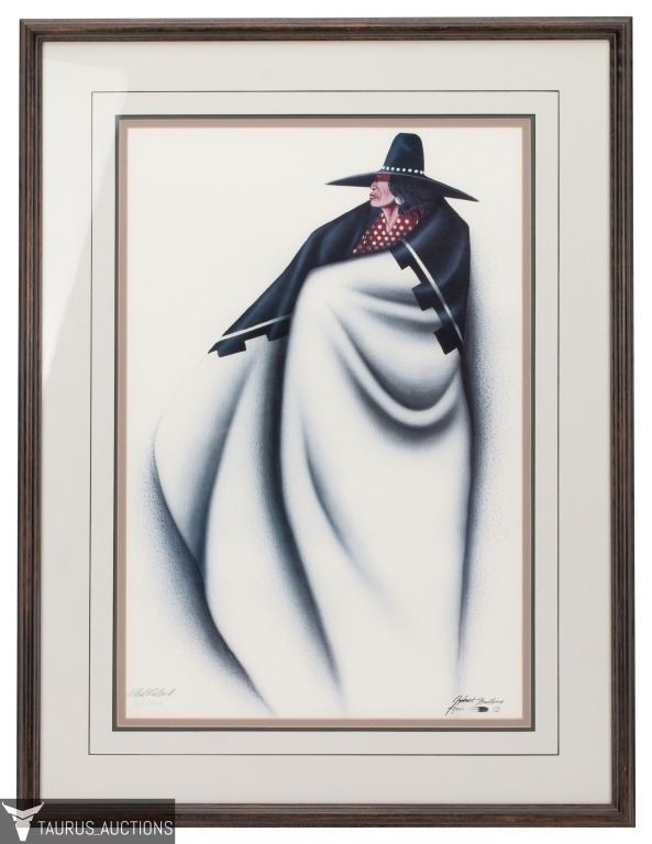 Item/Description: Framed pencil signed lithograph features a stylized native American figure wrapped in a blanket. Pencil signed and numbered lower left: Robert Redbird 817 / 1000. Signed in plate lower right. Robert Redbird, Native American artist who painted in order to preserve and communicate the Kiowa culture. He is known primarily for his blanket-wrapped Southern Plains figures and depiction of Kiowa folklore. (Chanto)