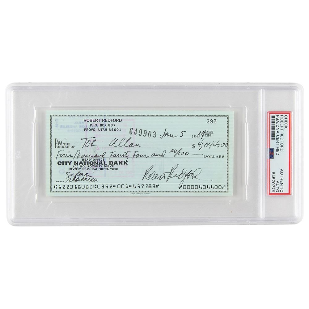 Personal check, 6 x 2.75, filled out and signed by Robert Redford, payable to Tor Allan for $4,044, January 5, 1984, with Redford adding a note to the memo field: "Safari research." In fine condition. Encapsulated in a PSA/DNA authentication holder. Accompanied by a full letter of authenticity from JSA. Redford's notation is undoubtedly related to the preproduction of the 1985 film Out of Africa, which costarred Meryl Streep, was a commercial success, and won seven Academy Awards including Best Picture and Best Director for Sydney Pollack.