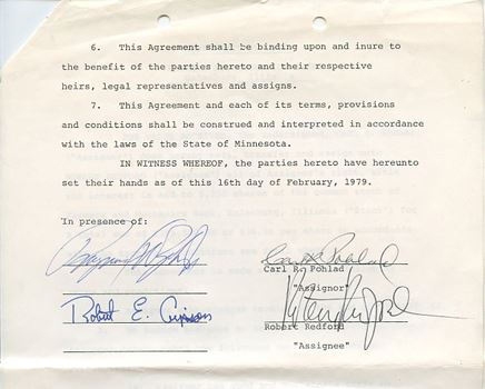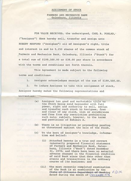 You are bidding on an original stock assignment in which Robert Redford agreed to purchase 5,250 shares of Farmers and Mechanics Bank. This item comes with a Certificate of Authenticity guaranteed for the liin wfe of the piece.