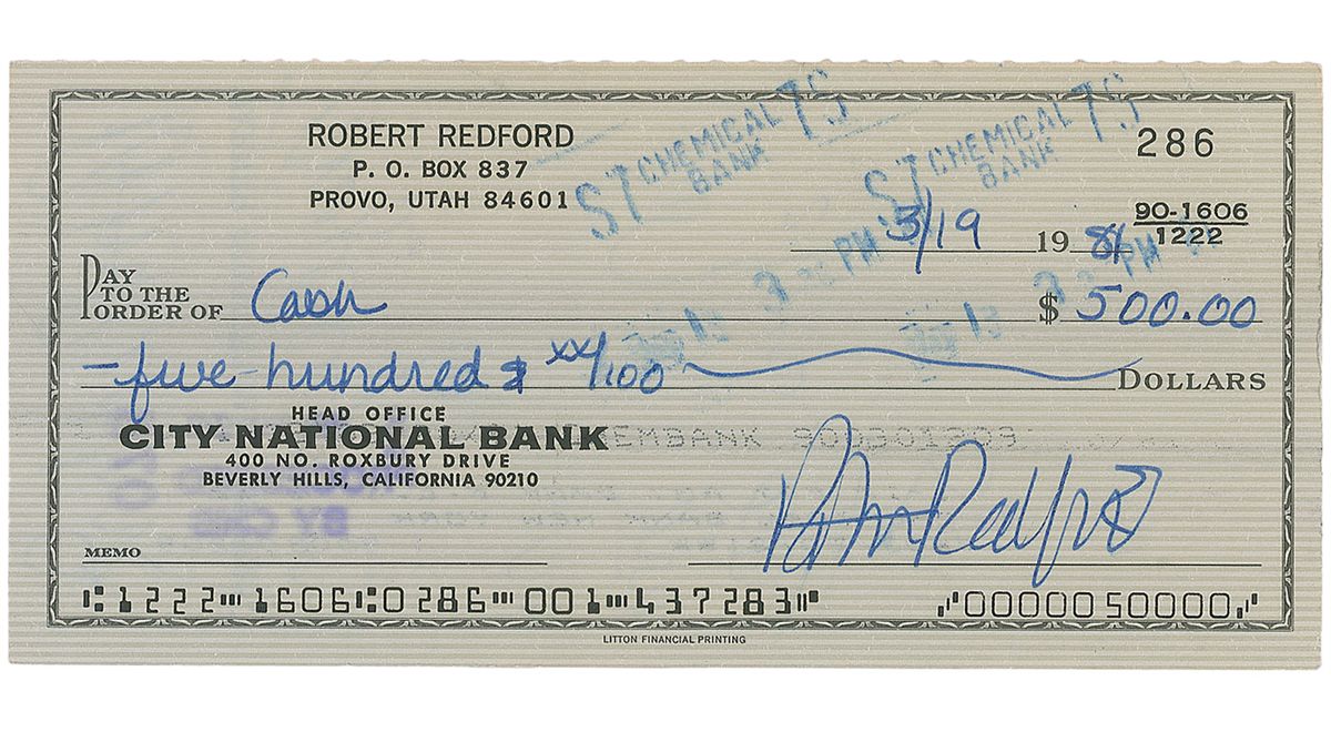 Personal check, 6 x 2.75, filled out in another hand and signed by Redford, payable to cash for $500, March 19, 1981, also endorsed on the reverse by Redford. In fine condition, with expected bank stamps.