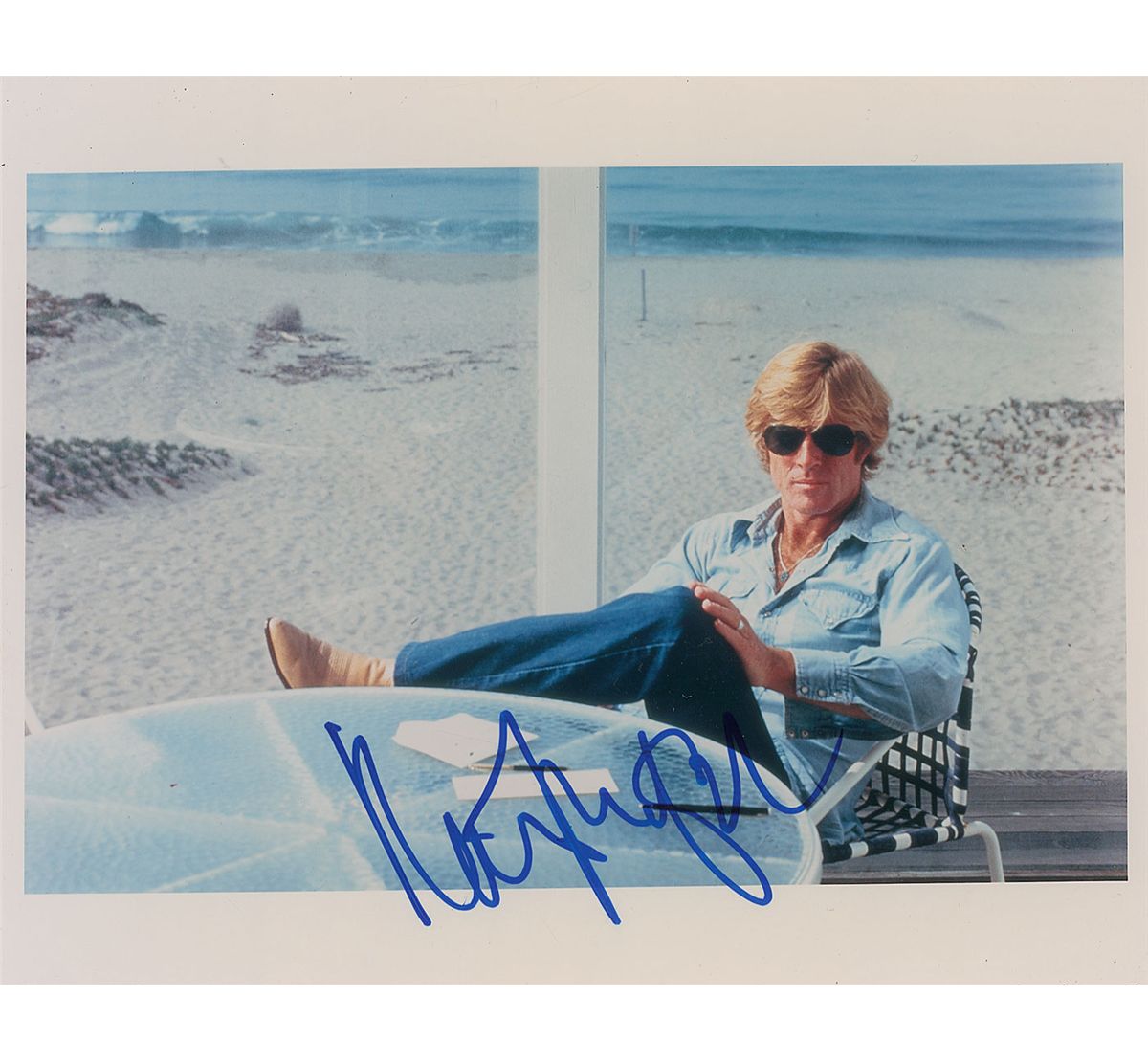 Color glossy 10 x 8 photo of a laid-back Redford lounging on a beachside deck, signed in blue felt tip. In fine condition.