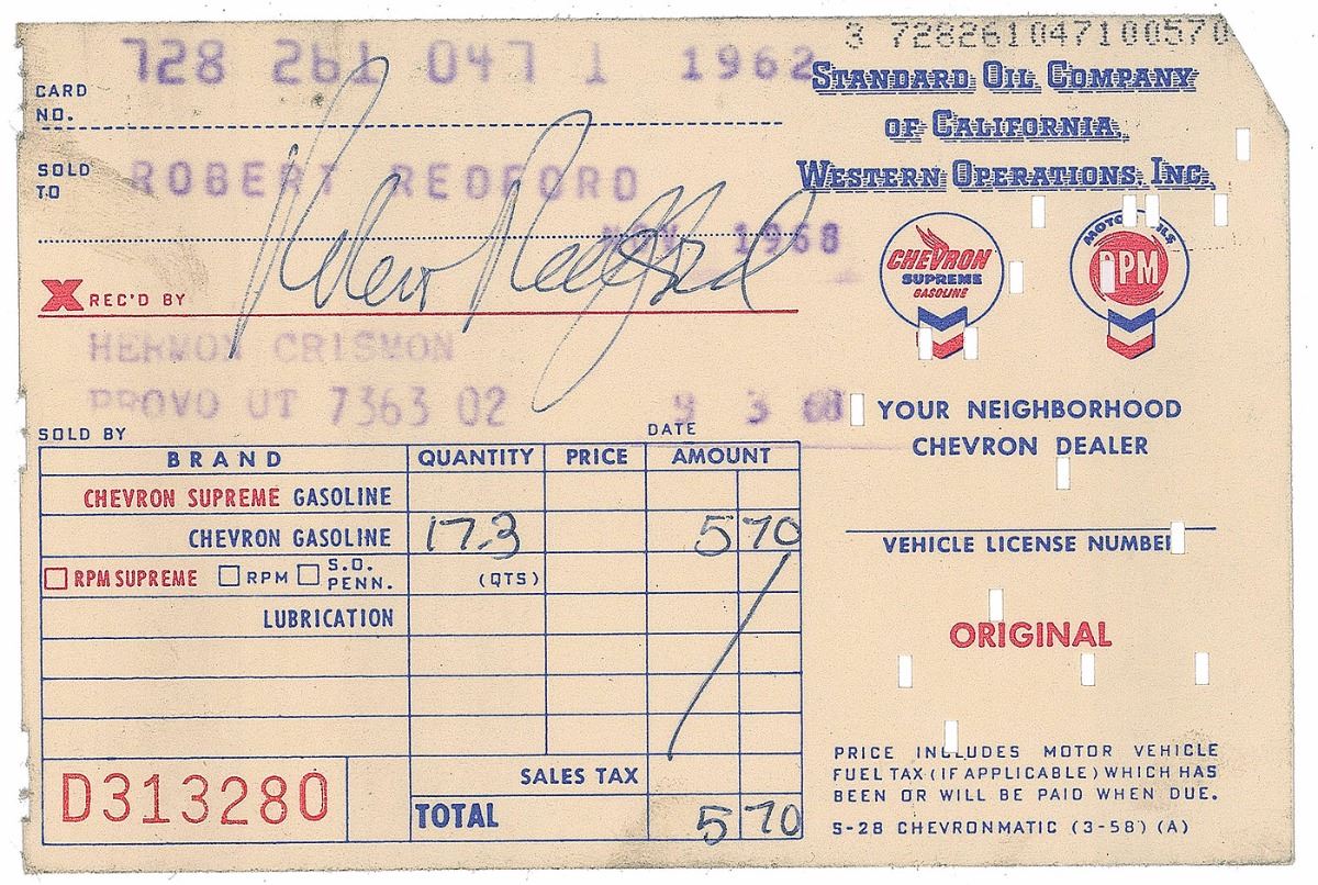 Standard Oil Company of California Western Operation, Inc. receipt, 4.75 x 3.25, dated September 3, 1968. A bill of sale for 17.3 quarts of Chevron gasoline for a total of $5.70. Signed at the top in black ballpoint by Redford. In fine condition, with expected document wear.
