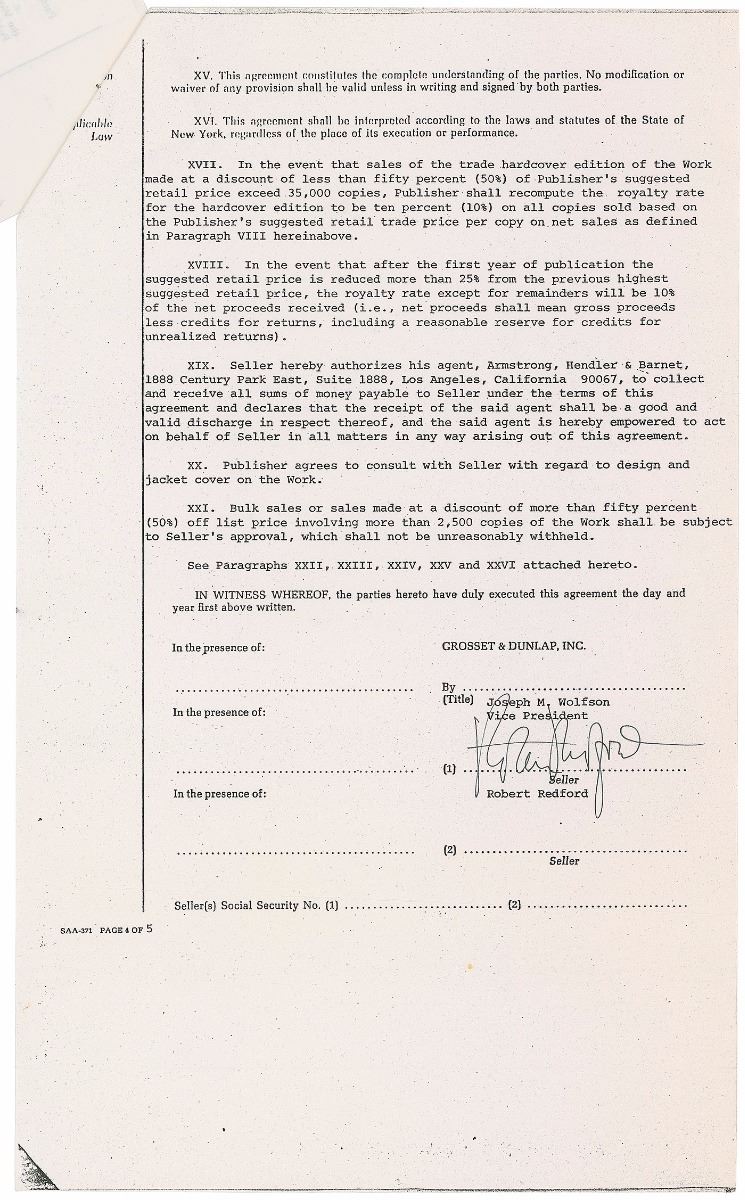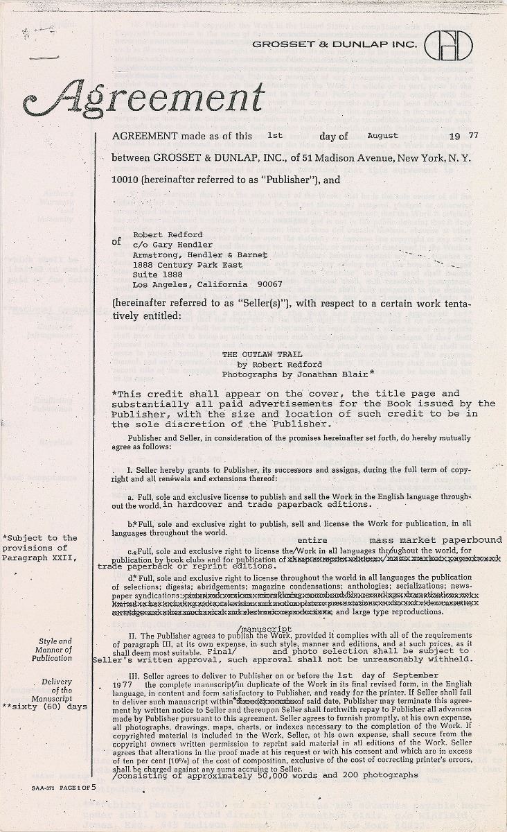 DS, four pages, 8.5 x 14, August 1, 1977. Agreement between Redford and Grosset & Dunlap, Inc., concerning the hardcover and trade paperback publication of “a certain work tentatively entitled: The Outlaw Trail, By Robert Redford, Photographs by Jonathan Blair.” Signed on the final page in black ink by Redford. In fine condition.