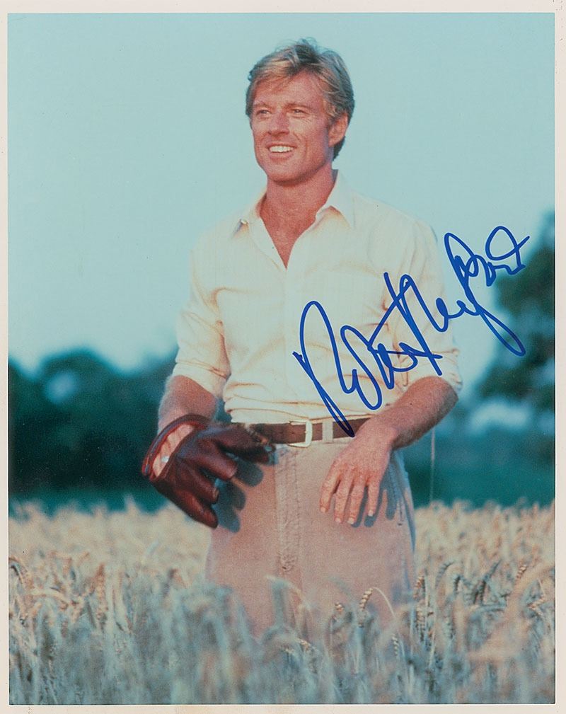 Color glossy 8 x 10 photo of Redford as Roy Hobbs from the 1984 film The Natural, signed in blue felt tip. In fine condition.