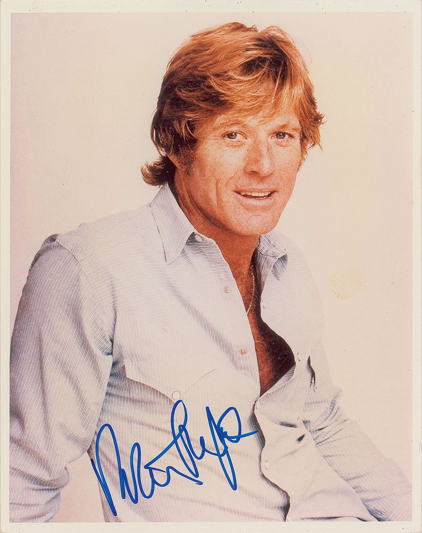 Color glossy 8 x 10 half-length photo of Redford posing with an opened collar shirt, signed in blue felt tip. In fine condition.