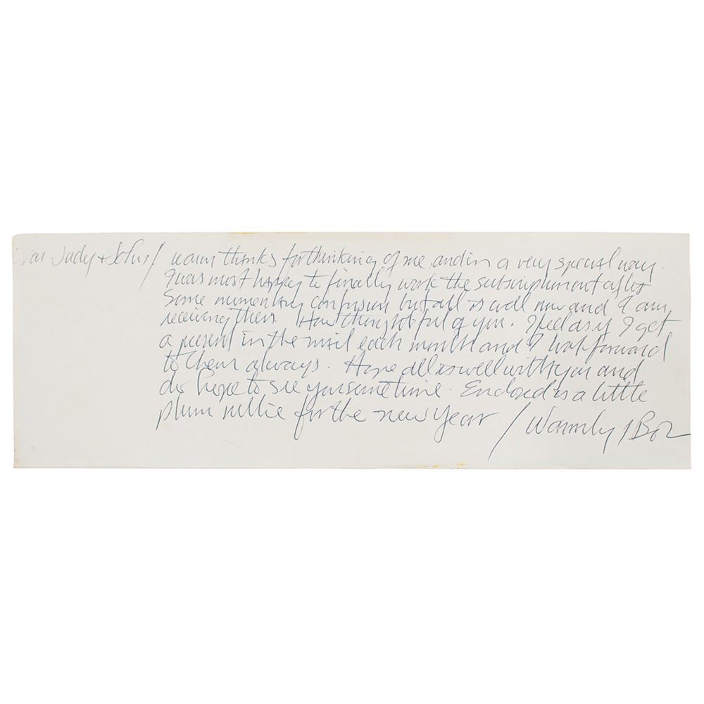 American artist (1938–2014) who for 45 years served as professor of painting and printmaking at the Yale School of Art, where he also became the first African-American to be appointed to the school's tenured permanent faculty. In his artwork, Reed is known for his geometric abstraction and personalized symbols to create a language of abstraction. Original painting by artist Robert Reed from his ‘Plum Nellie’ series, accomplished in watercolor on 13 x 10.25 trimmed canvas, signed and inscribed along the bottom border in pencil, “For Judy & John, Best wishes, Bob.†Framed to a slightly larger size. Included with the artwork is an ALS signed “Bob,†one page, 13 x 4.5, no date (circa 1970s), forwarding the painting to the recipients, in full: “Warm thanks for thinking of me, and in a very special way. I was most happy to finally work the subscription out after some momentary confusion but all is well now and I am receiving them. How thoughtful of you. I feel as if I get a present in the mail each month and I look forward to them always. Hope all is well with you and do hope to see you some time. Enclosed is a little Plum Nellie for the New Year.†In very good to fine condition, with soiling to the edges, and dampstaining to the lower right of the painting.