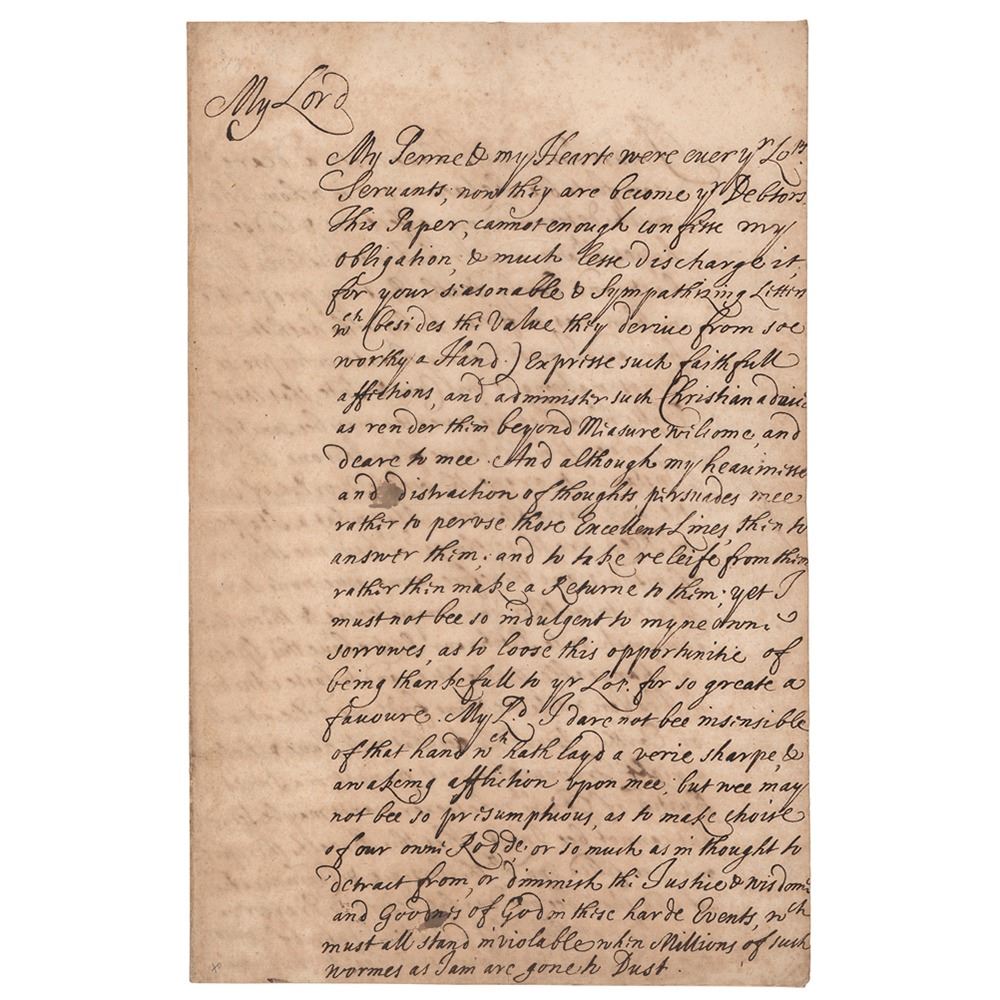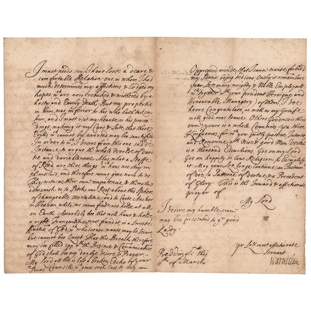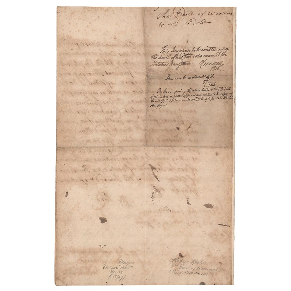 LS signed “Warwicke,†three pages on two adjoining sheets, 7.25 x 11.5, March 11, 1658. Letter to a "Lord," evidently Henry Cromwell, Lord Deputy of Ireland and son of Oliver Cromwell, announcing the death of his grandson. In part: "I must needs say I have loste a deare & comfortable Relation, one in whom I had much determined my affections, & lodged my hopes, wch. are now rebuked & withered by a hasty and Early Death; But my propertie in him, was inferior to his who hath taken him; and I must rest my hearte in his proceedings; making it my care & suite, that those Evills wch cannot bee averted, may bee sanctifyed." Notations on the reverse denote Henry Cromwell was the recipient. In fine condition, with light foxing and toning. The 2nd Earl of Warwick's grandson, also named Robert, married Frances Cromwell, daughter of the Lord Protector Oliver Cromwell, in 1657, but died of consumption within three months of the marriage on February 16, 1658.
