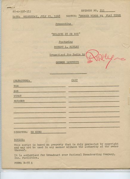 You are bidding on an original radio play script for "Ripley's Believe It or Not" signed by Robert Ripley. This item comes with a Certificate of Authenticity guaranteed for the life of the piece