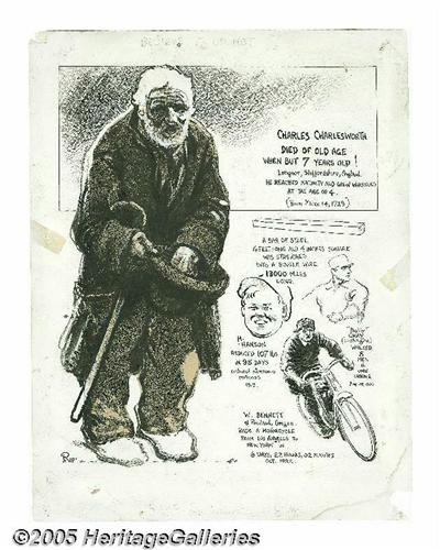 <B>Robert Ripley Studio - Ripley's Believe It or Not Daily Comic Strip Original Art (King Features Syndicate, undated).</B></I> Robert Ripley gained fame by gathering bits and pieces of weird and obscure information from around the world, presenting them in comic strip form to the general public and inviting them to "Believe It...Or Not!" Still running many years after his death, the comic strip has spawned a vast Ripley empire, including museums, aquariums, books, and even a TV series. Highly prized by collectors, original Ripley studio art is rarely offered for auction, and this is a terrific piece highlighting Charles Charlesworth, who "died of old age when but seven years old!" This strip is undated, but may be from the '20s. The figure of Mr. Charlesworth mostly consists of a piece cut from a darker, more textured sheet of brown paper, which was glued to the backing board. The art is in Very Good condition with a small piece missing from the lower right corner and some tape stains and general discoloration in the margins. The image area measures 9" x 11".