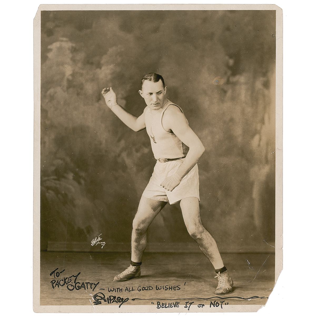 Vintage glossy 7.75 x 9.75 photo of Ripley playing handball, signed and inscribed in fountain pen “To Packey O’Gatty, with all good wishes! Ripley ‘Believe It Or Not’.” In good to very good condition, with scattered creasing, edge tears (a couple extending into signature and inscription), missing three corner tips, and surface impressions.