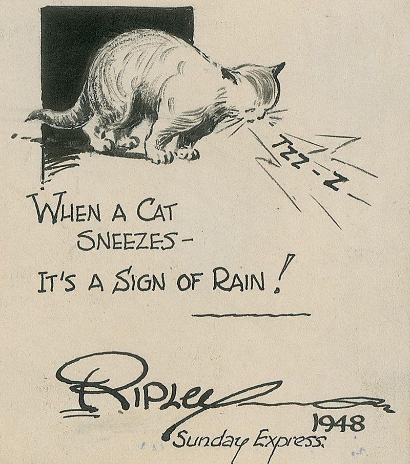 Original vintage signed ink and watercolor sketch for a newspaper of a cat sneezing on an off-white 3.25 x 3.5 card, with Ripley writing “When a cat sneezes—It’s a sign of rain!,” and signed at the bottom, “Ripley 1948, Sunday Express.” In fine condition, with a bit of trivial soiling.