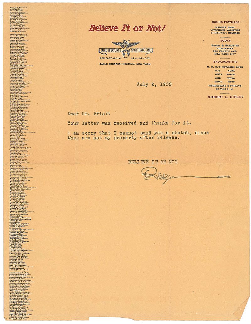 Two items: one vintage glossy 7 x 9 photo, signed and inscribed in black ink, “To Royce Prior, with best wishes of Ripley”; and one TLS signed “Ripley,” one page, 8.5 x 11, Believe It or Not! letterhead, July 2, 1932, responding to an autograph request. In overall very good condition, with scattered marks and creases, and trimmed edges to the photo, and intersecting folds with slight separations and scattered creases to the letter.
