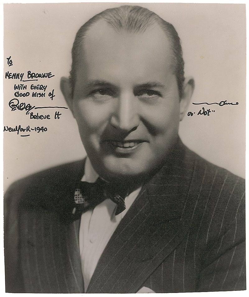 Vintage matte-finish 7.25 x 8.75 head-and-shoulders photo, signed and inscribed in fountain pen, “To Kenny Browne, with every good wish of Ripley ‘believe It Or Not’ New York—1940.” In fine condition, with slightly trimmed edges.