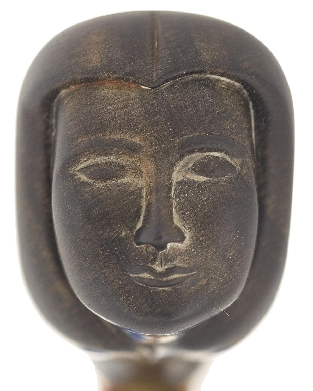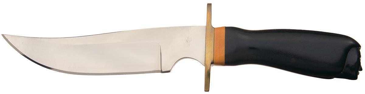 This knife was fabricated by Robert Rippy, a combat knifemaker from the 80s and early 90s whose work was often featured in the Knives Annuals Books. The 6 1/2 inch long blade has a trailing point and is marked "RIPPY". Brass diamond shaped guard. Contrasting hardwood handle with a female face carved on the butt. OAL: 11 1/4".