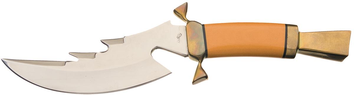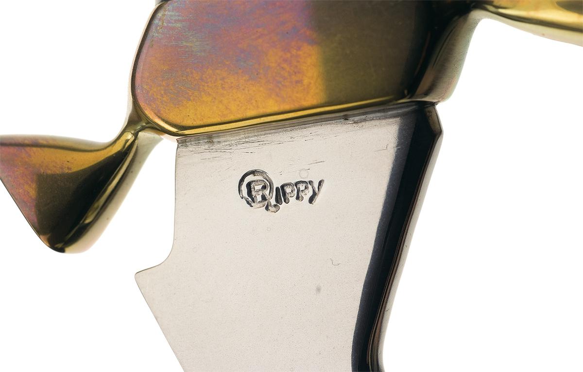This knife was fabricated by Robert Rippy, a combat knifemaker from the 80s and early 90s whose work was often featured in the Knives Annuals Books. The artfully shaped blade is 6 inches long and marked "RIPPY". Brass guard and pommel with a micarta handle accented with two black stripes. OAL: 11 1/4".