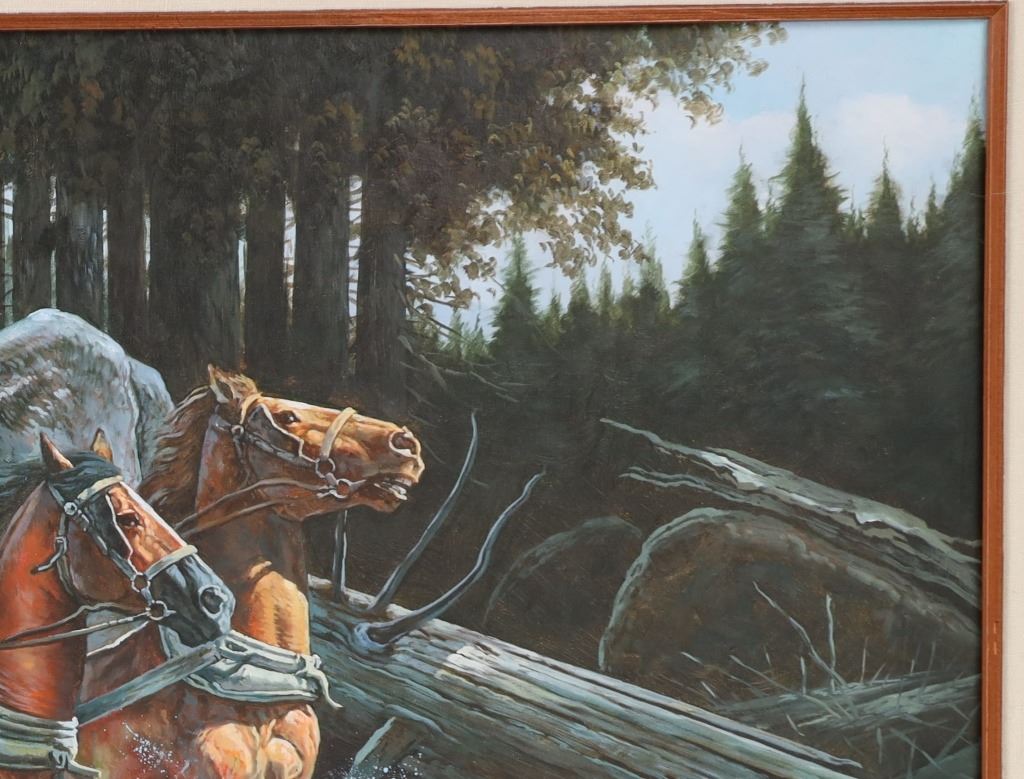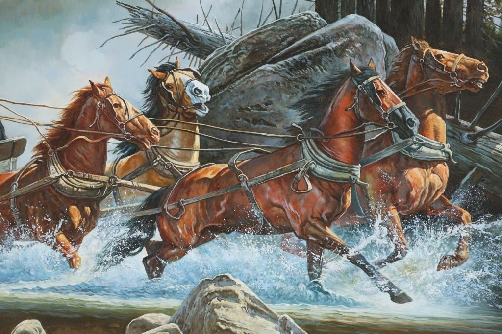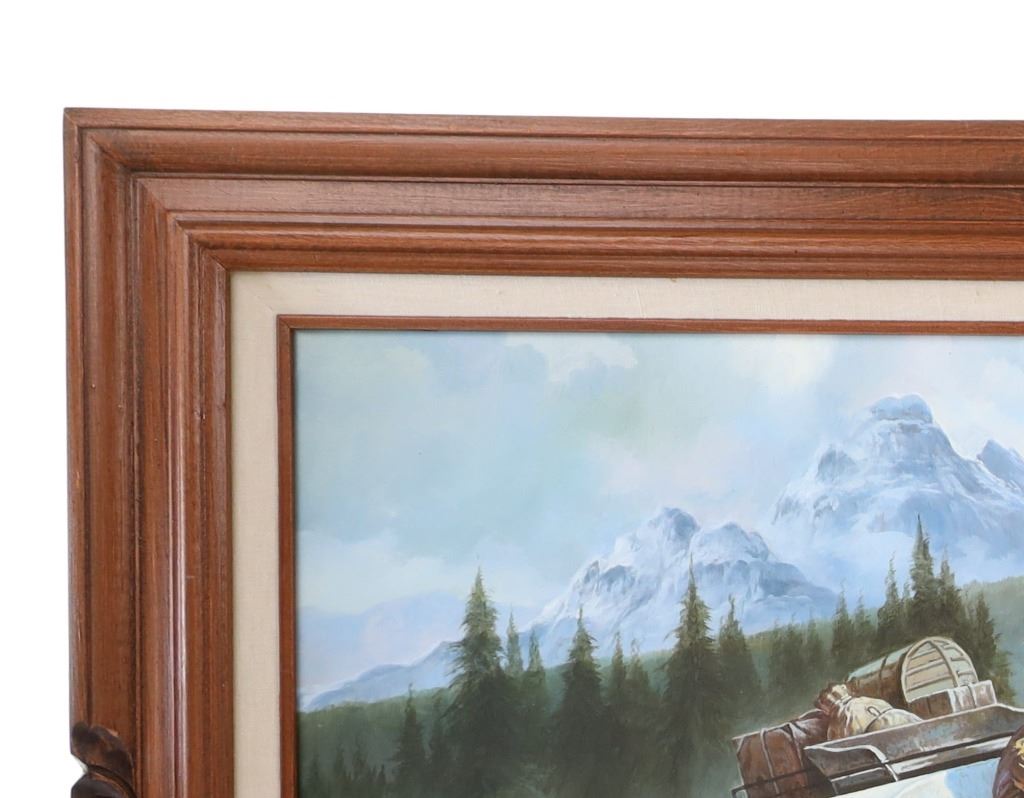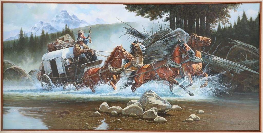 Featured in this lot is this "Stagecoach" oil painting by American artist Robert Rossi d'Providence born in 1938 and died in 2011. The painting features a wonderfully and professionally crafted oil on canvas construction that shows a fall scene of a stagecoach crossing a creek bed with a tree line in the background and the shotgun rider staying on alert with rifle in hand. The artist signature is shown in the bottom right hand corner. According to Mr Rossi's obituary in the Nov 1,2011 WARWICK BEACON, his paintings were in the collections of Alex Trebec, Frank Sinatra, Dean Martin, Vincent Price and many other of Hollywoods royalty. When he moved back east in the early 70s, he changed his name to Rossi d'Providence. He was a member of Mensa, a black belt that trained with Chuck Norris, a poet, and oddly, an artist that destroyed many of his own works. Leaving an interesting and probably small legacy of great work. Born Robert J. Rossi in 1938 in Providence, Rhode Island, he began signing his works as Rossi d'Providence after 1971. He paints in oil only-realist and abstract works but does not sell his art publicly. Rossi has produced tens of thousands of oil paintings all of his life. He rarely stretches his canvases on wood stretchers and never frames them except on rare occasions. He gives most of his works to friends and acquaintances. Many times he has disposed rolls of his works in trash bins or given it to Salvation Army stores around New England.His large painting depicting Alexander and Darius's battle at the River Issus (333BC) is on view at Brown University in Providence, Rhode Island. The condition of this painting is in good condition that shows no obvious signs of damage and shows good overall condition. The measurements of this painting is 31 1/8" x 54 7/8" and the visible artwork measures 23 3/4" x 47 5/8".