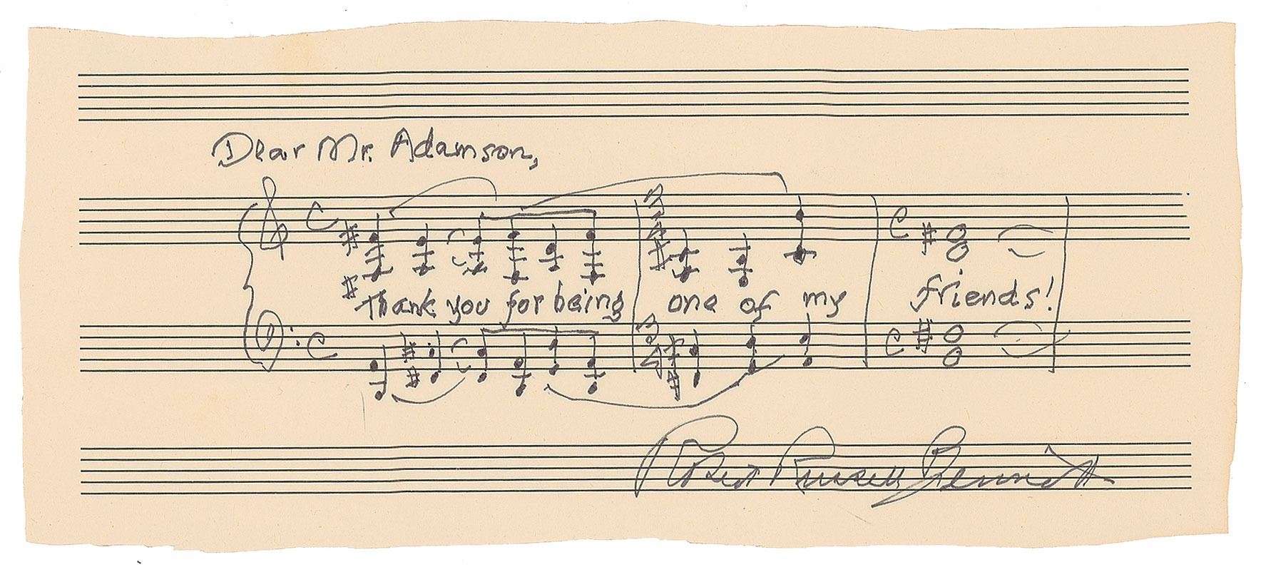 AMQS on an off-white 9 x 4 musically-lined sheet, signed and inscribed in black ink, "Dear Mr. Adamson, Robert Russell Bennett," who pens six bars of music and adds the words "Thank you for being / one of my / friends!" In fine condition.