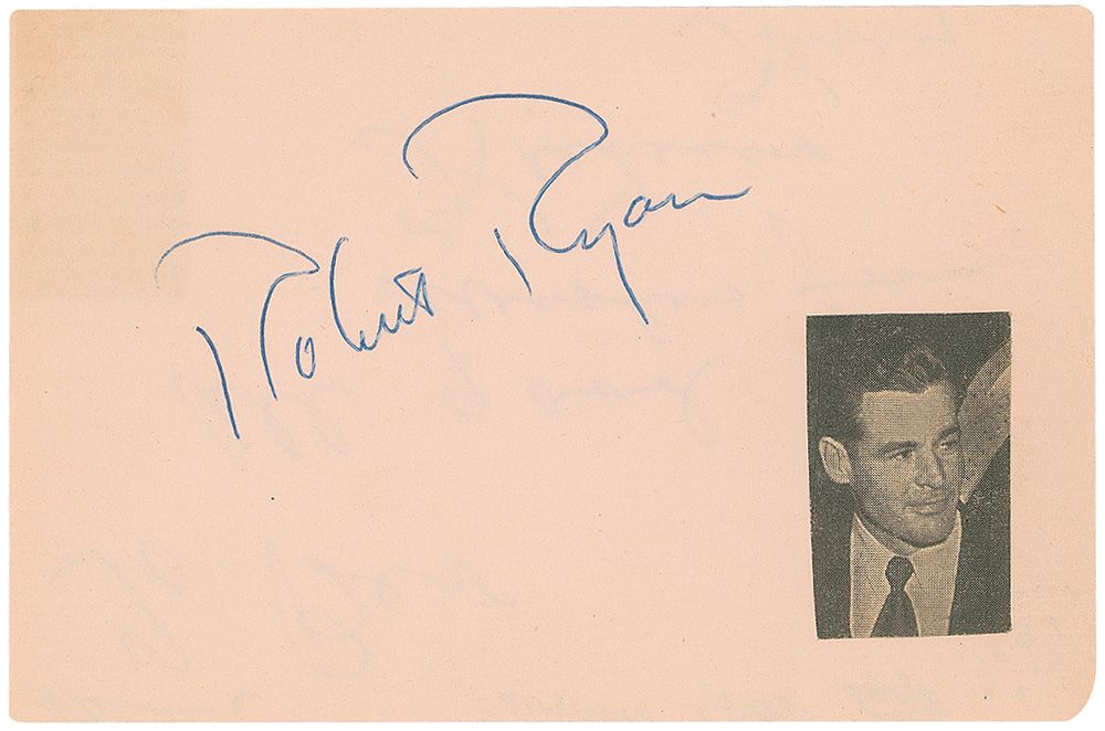 Vintage ballpoint signature, “Robert Ryan,” on an off-white 5.5 x 3.5 album page. A small newspaper photo of Ryan is affixed to the lower right. Katherine Derry has also signed and inscribed the reverse, and a photo of her is affixed as well. In fine condition, with some show-through from signature and photo on reverse.