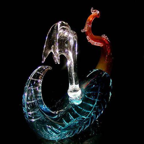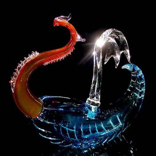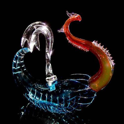 Robert Scavuzzo (New Day Glass) blown glass sculptural teapot sculpture in the shape of a dragon, in aqua, amber, and clear glass, with a clear glass stopper. Signed. Height 14"; Length 16". Donated by: Lee & Lois Kupersmith.<p>Proceeds from the auction will go to benefit Santa Cruz, California glass artist Steven Lundberg, who, after 30 years of blowing glass locally, was diagnosed with amyotrophic lateral sclerosis, or ALS (Lou Gehrig's disease). This auction is a fundraising effort to help Steve meet the challenges of this disease.<p>Costs of treating ALS over a period of time can be exorbitant. In the short-term, Steve needs basic equipment such as an electric scooter and pointing devices to help him read and write.<p>Please join us for this auction, and help support a friend. Check out our other auctions to see the 150 paperweights, vessels, and glass sculptures from internationally known glass artists, donated by generous artists, galleries, and glass collectors from all over the country. Please contact us at 1-800-538-0766 or (831) 427-1177 for more information, or see <a href=http://www.selman.com/press target=_blank>www.selman.com/press</a>.