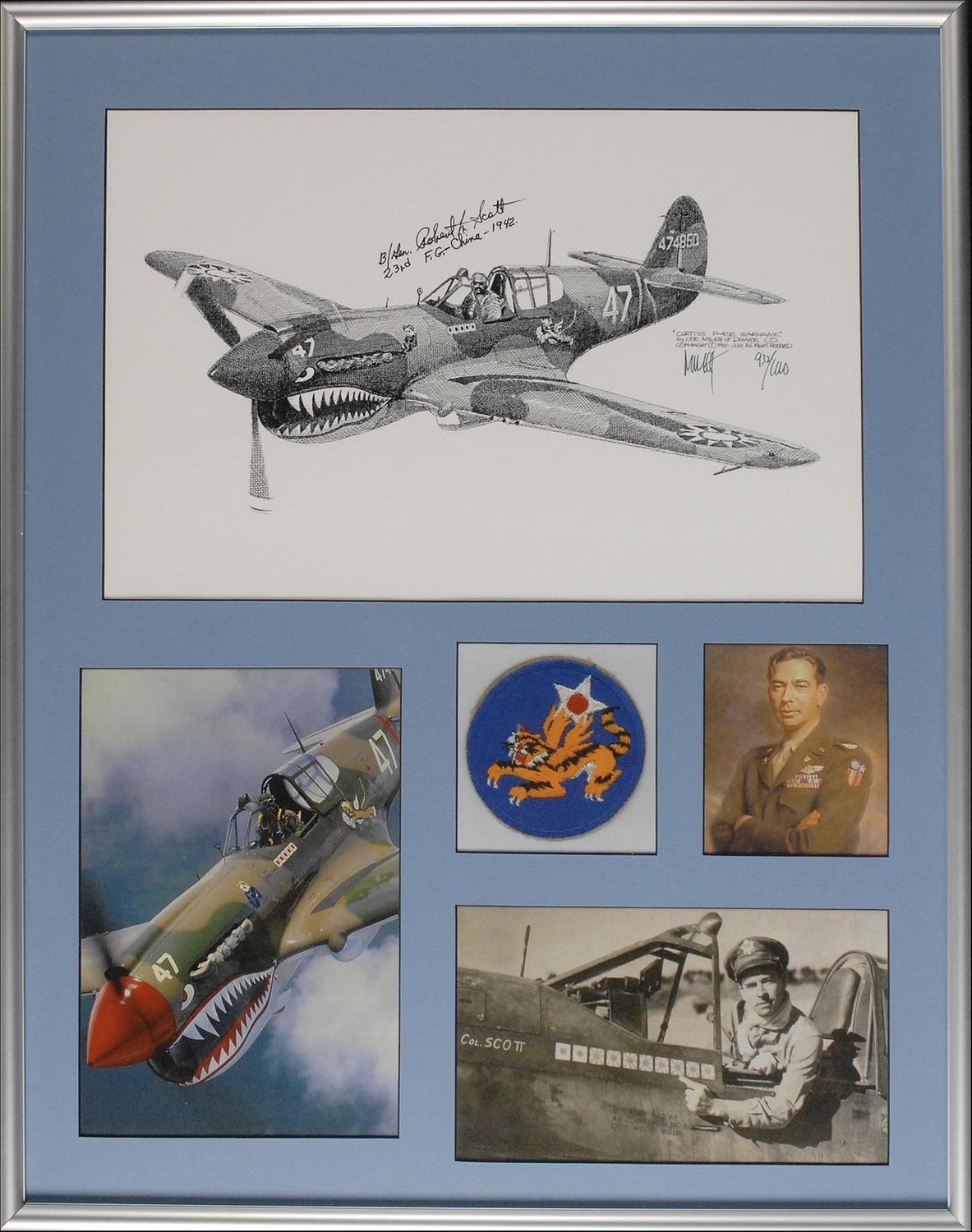 World War II Ace credited with 13 victories in the Flying Tigers and the 23rd Fighter Group. Scott pioneered air operations flying from India over the dangerous Himalayan mountains - ‘The Hump’ - to supply the Flying Tigers in China. Limited edition 17 x 11 print of Scott’s P-40 Warhawk, numbered #932/1000, signed in black felt tip, “B/Gen. Robert L. Scott 23rd F. G.—China—1942.” Also signed in black felt tip by the artist, Joe Milich. Matted and framed with four photos, to an overall size of 21 x 26.5. In fine condition. Oversized.