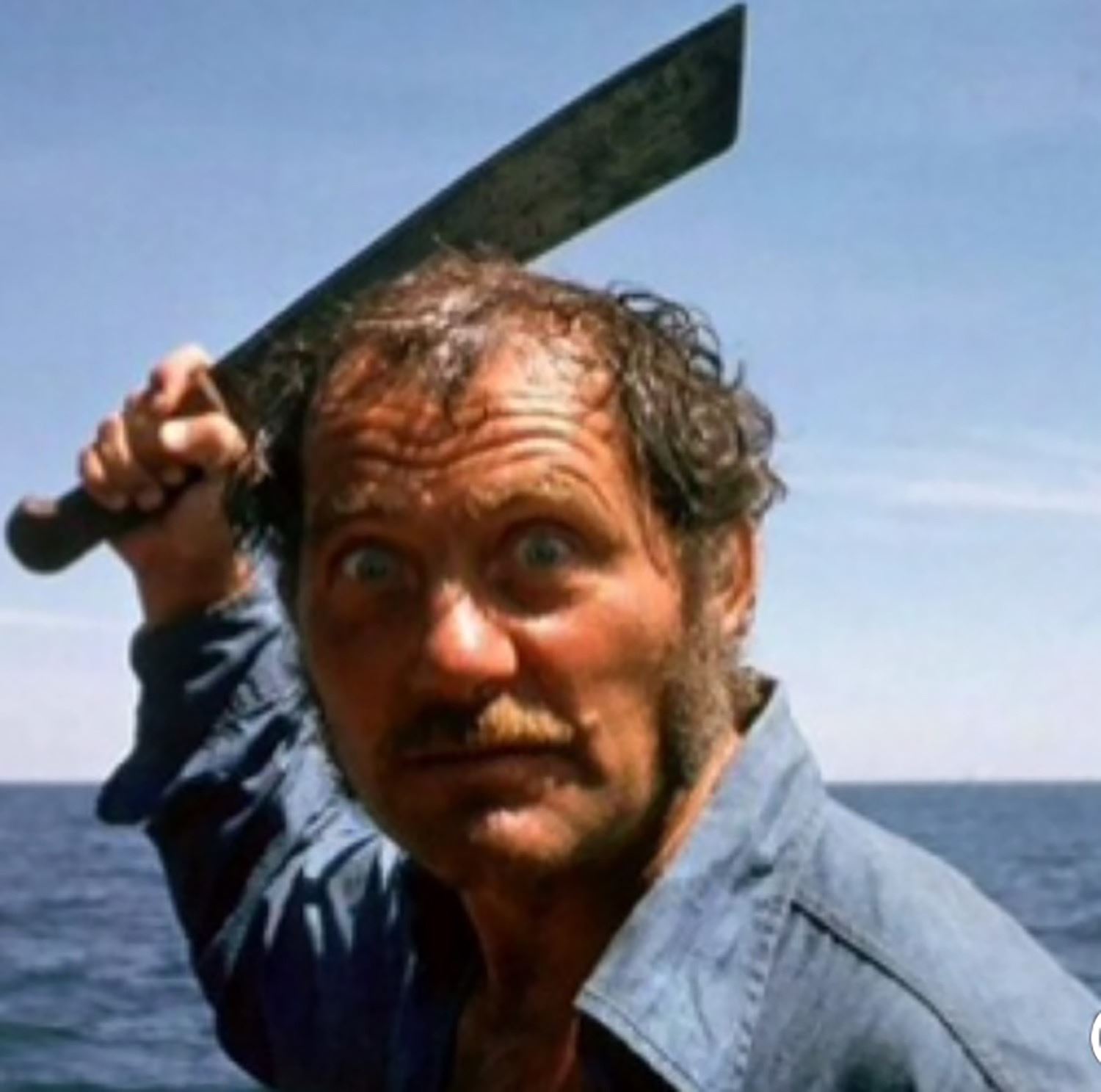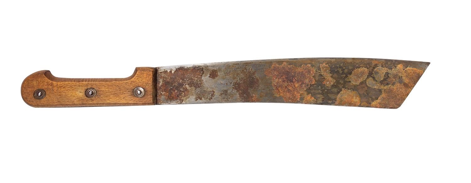 (Universal, 1975) An original hero machete prop used by Robert Shaw as Quint in Jaws. This machete was used for close-up shots of Quint on the Orca, and is made of metal and wood. The machete comes from the esteemed Jaws prop collection of Chris Kiszka, and was given directly to Kiszka by a member of the production crew following the completion of the film. A letter of provenance from Kiszka will be provided to the winning bidder. Measuring 20.5" long, the prop is in good condition with spots of rusting as seen in the film, which has likely increased over time.