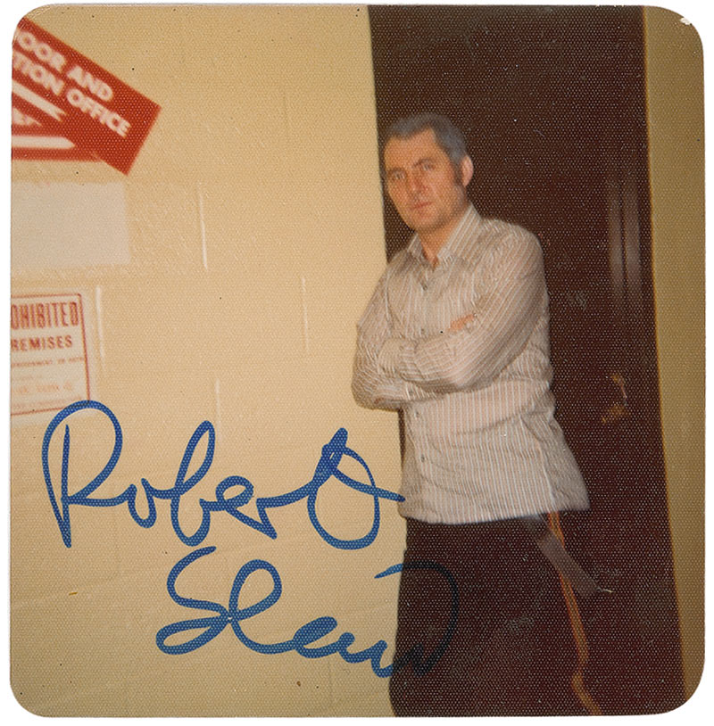 Color satin-finish 3.5 x 3.5 candid photo of Shaw, signed in blue felt tip, “Robert Shaw.” In fine condition, with light contrast to the end of the signature.