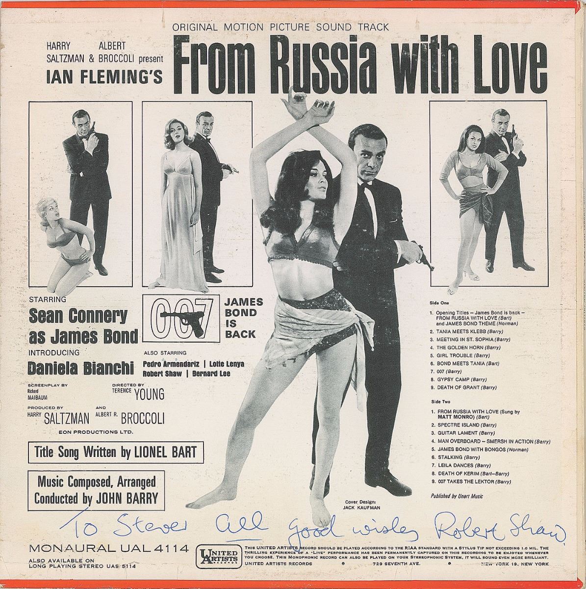 From Russia with Love album signed and inscribed on the back cover in blue ballpoint, “To Steve, all good wishes, Robert Shaw.” In fine condition. The record is included.