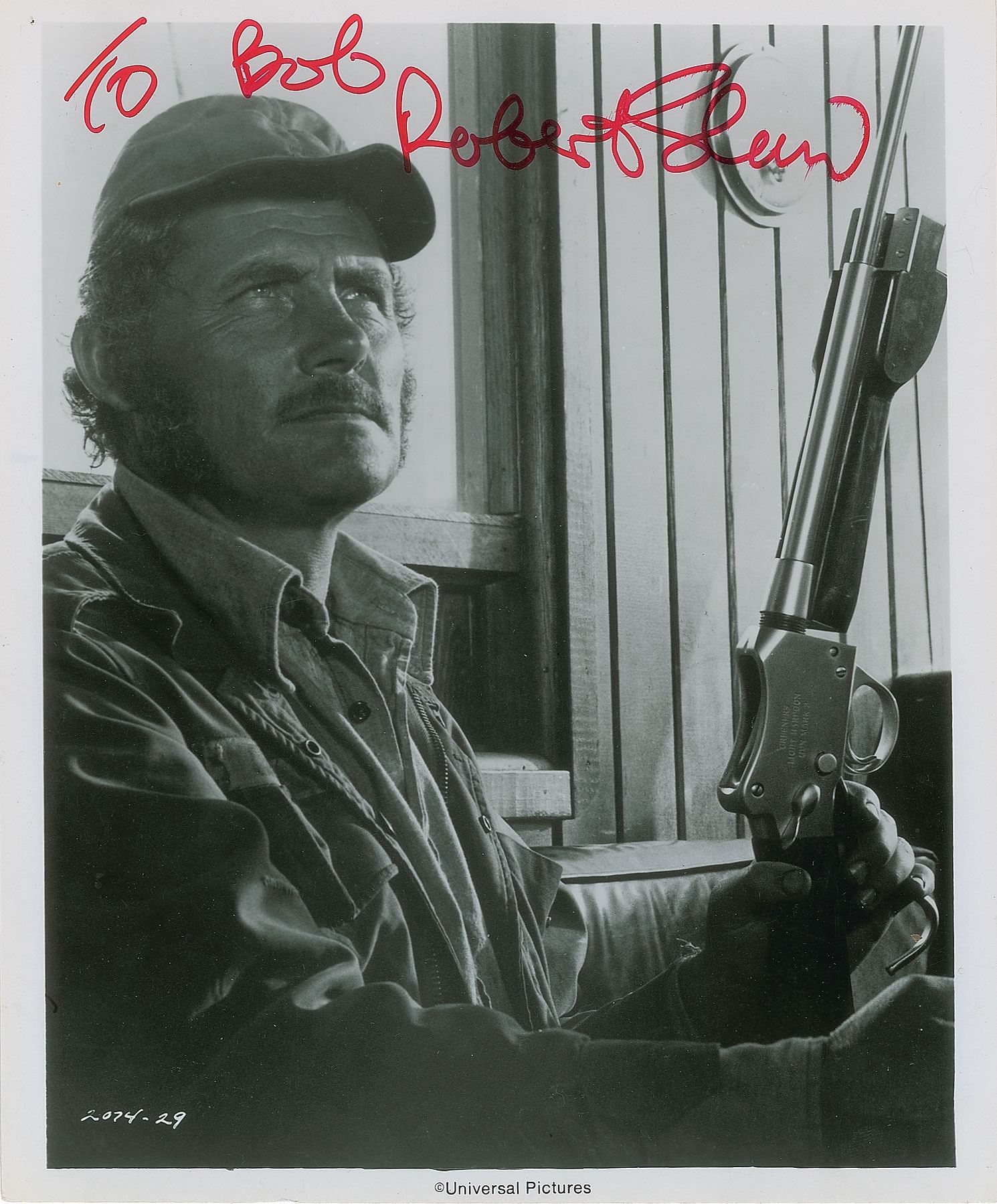 Glossy 8 x 10 Universal Pictures publicity photo of Shaw as the shark-obsessed fisherman Quint in Jaws, signed and inscribed in red felt tip, "To Bob, Robert Shaw.” In fine condition.