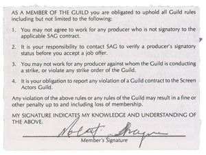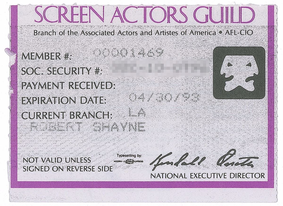 Robert Shayne’s Screen Actors Guild membership card, 3 x 2.25, signed on the reverse in black ballpoint. The card features membership and social security numbers, as well as an expiration date, “04/30/93.” In fine condition, with expected wear to edges.