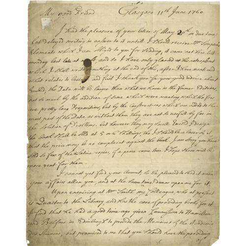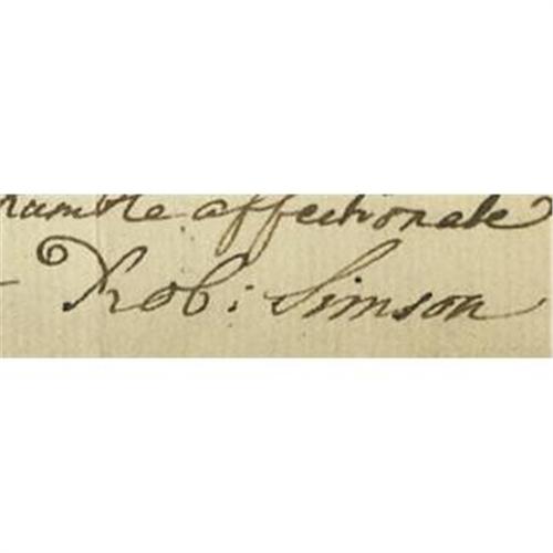 <B>Robert Simson Autograph Letter Signed</B></I> "<I>Rob: Simson</B></I>" (1687-1768). Three pages, 7.25" x 9.25", Glasgow, June 11, 1760. Simson comments on another mathematician, discusses Euclid, and mentions his forthcoming edition of <I>Data,</B></I> in part: "<I>the Data will be longer than what we have in the former editions...the book shall be sold at 5 or 6 shillings, tho I should be a loser by it...</B></I>" A British mathematician and professor of mathematics, Simson is known for his criticisms and commentaries on the ancient geometers, specializing in Euclid. His <I>Euclid's Element</B></I> was long the standard Euclid text in England. The pedal line of a triangle is sometimes called the Simson line after him. Our research shows no record of a sale of any Simson autograph material in recent years. This is a special opportunity to own a content letter from a legendary geometer. Having a paper conservator repair the fold splits and clean the light soiling would make this letter worthy of display in any fine collection or museum. <BR><BR>Also included is a 1776 dated engraving of Simson in excellent condition. From the Henry E. Luhrs Collection. Accompanied by LOA from PSA/DNA.