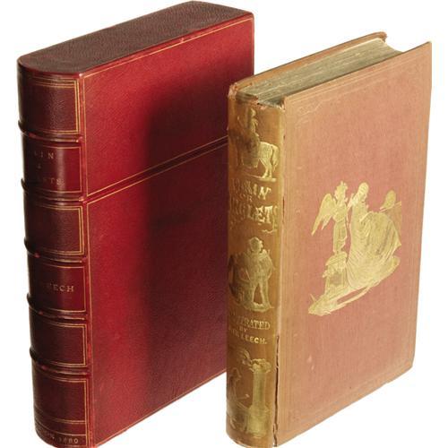 <B>Robert Smith Surtees' <I>Plain or Ringlets?</B></I> Illustrated by John Leech.</B></I> (London: Bradbury & Evans, 1860), first edition, 406 pages, red cloth binding with gilt lettering on spine and cover, and additional blind-stamped decoration around perimeter of cover, 8vo (6" x 9"), no dust jacket. Thirteen hand-colored plates and fifty-four wood-engravings in text. Deckled fore-edge. Housed in beautiful red leather slipcase with gilt lettering on spine. Surtees trained in his young life to build a career as a solicitor, but began writing for <I>Sporting Magazine</B></I> in 1831, and found his true calling. Immensely popular in the early Victorian period, Surtees was a pioneer of the English sporting novel and a biting satirist who supposedly had a significant influence on Charles Dickens. Surtees' <I>Jorrocks' Jaunts and Jollities</B></I> was said to be a touchstone in the construction of Dickens' <I>Pickwick Papers.</B></I> <I>Plain or Ringlets</B></I> is a society novel, more concerned with Victorian views on marriage and money, and was the last novel Surtees would see published in his lifetime. This copy is in good condition throughout, with noticeable separation of the front joint, slight chipping at the head and tail of the spine, and rubbed corners. Overall, this handsome volume would add to the library of anyone interested in Victorian literature and an author once deemed "England's anticipation of Mark Twain."