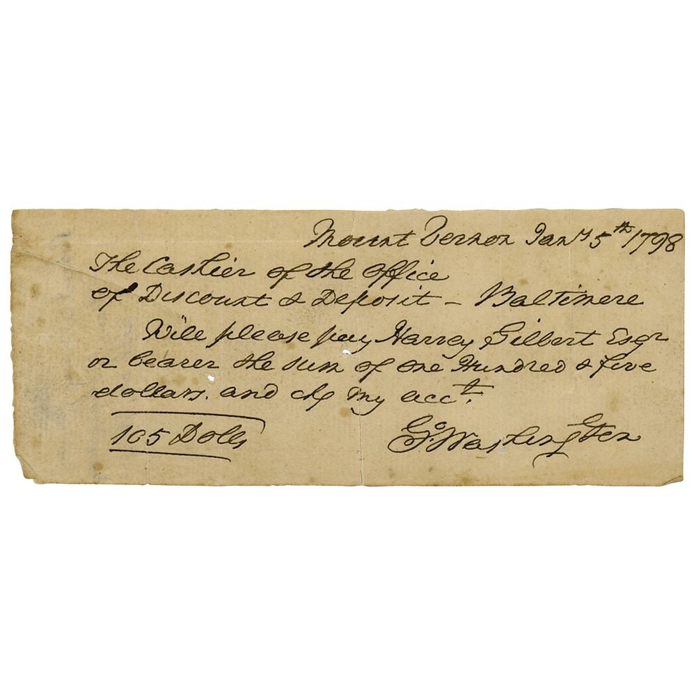 English-born forger (1813–1876) who forged letters from luminaries and historical figures like George Washington, Benjamin Franklin and Horatio Nelson. Robert Spring forgery of a manuscript document signed “Go: Washington,” one page, 6 x 2.5, January 5, 1798. A forged pay order directed to the Office of Discount and Deposit in Baltimore, requesting that Harrey Gilbert be paid “the sum of one hundred & five dollars and chg my acct.” In fine condition, with complete separation along the central vertical fold repaired with archival tape on the reverse.