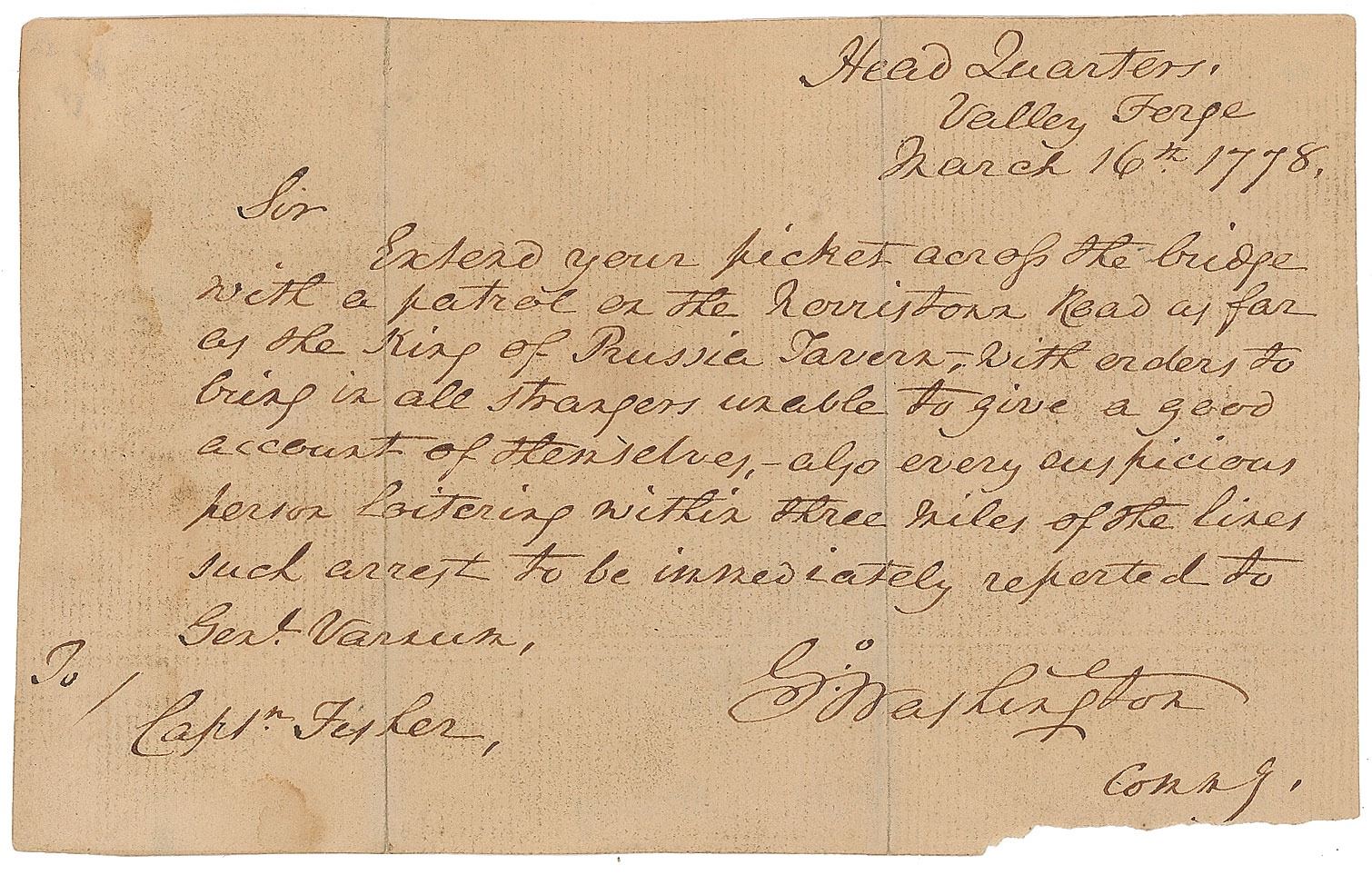 English-born forger (1813–1876) who forged letters from luminaries like George Washington, Benjamin Franklin and Horatio Nelson. Robert Spring forgery of an ALS signed “G:o Washington, Comm'g,” one page, 6.75 x 4.25, March 16, 1778. A letter to "Capt'n Fisher," in full: "Extend your picket across the bridge with a patriot on the Norristown Road as far as the King of Prussia Tavern,—With orders to bring in all strangers unable to give a good account of themselves,—also every auspicious person loitering within three miles of the lines such arrest to be immediately reported to Gen'l Varnum." In fine condition, with repairs to fold separations on the reverse.