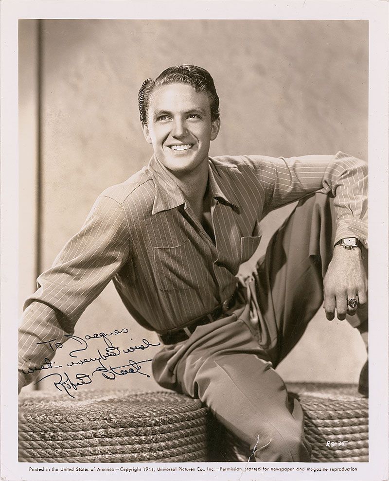 Vintage glossy 8 x 10 Universal publicity photo from 1941, signed and inscribed in fountain pen “To Jacques, with every best wish, Robert Stack.” In very good condition, with tear to bottom edge, some light surface marks and creases, a bit of irregular ink adhesion to signature, and some light silvering.