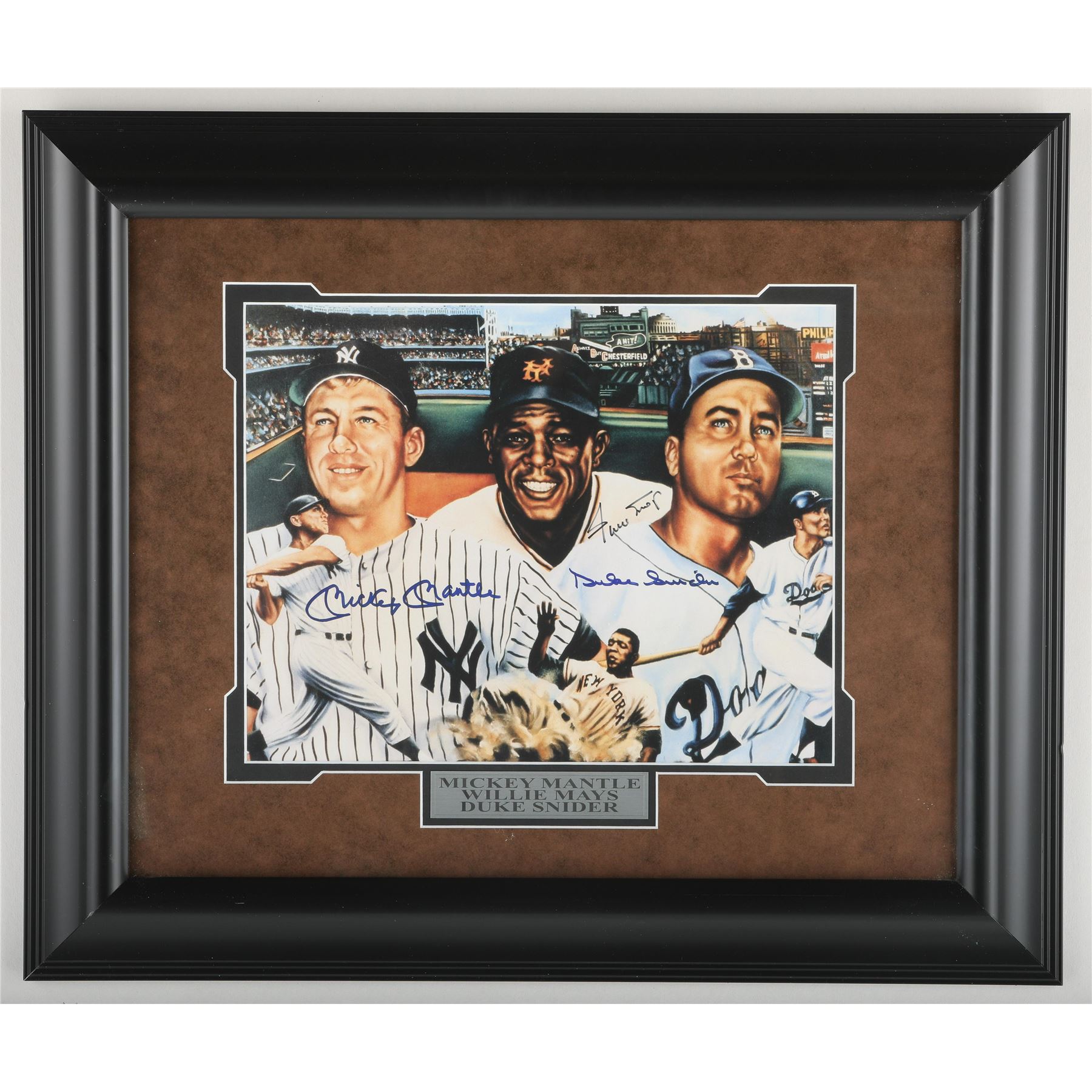 Robert Stephen Simon's "Mickey, Willie & The Duke" autographed lithograph. This lithograph has been signed by the great New York Hall of Fame centrefielders Mickey Mantle, Willie Mays, and Duke Snider. Image- 11" x 14". Frame- 20 1/4" x 24 1/4".