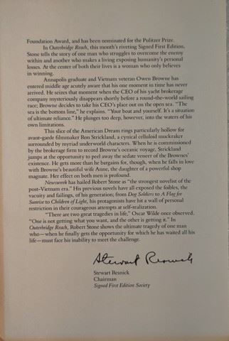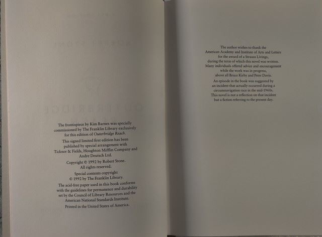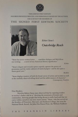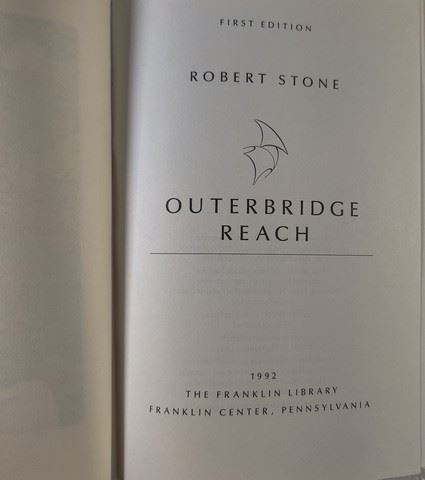 Outerbridge Reach (The Franklin Librarym 1992) first edition leatherbound copy, printed exclusively for the Signed First Edition Society and signed by author Robert Stone. 409 pages.