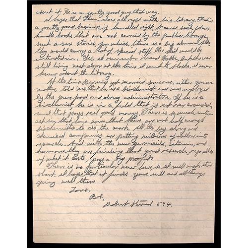 <Our item number 141086><B>Stroud, Robert.</B> (1890 - 1963) "The Bird Man of Alcatraz," imprisoned for the murder of a man in Juneau and a prison guard. While incarcerated, Stroud made his life's work the study of birds and became a widely-respected ornithologist. Autograph letter signed ("Bob Robert Stroud 544") in pencil, Alcatraz Prison, CA., March 5, 1946. To his sister Marnie, with detailed news of his health and other personal news. "…you don't have to thank me for any nice things I say about you. You have it all coming. I am not feeling very good but ….There is a new Doctor here…. " Fine. <BR>Estimated Value $200 - 300. <BR><BR>Our item number 141086<BR><IMAGES><P ALIGN="CENTER"><IMG SRC="http://www.goldbergcoins.net/liveauction/49jpegs/141086.jpg"> </P></IMAGES>