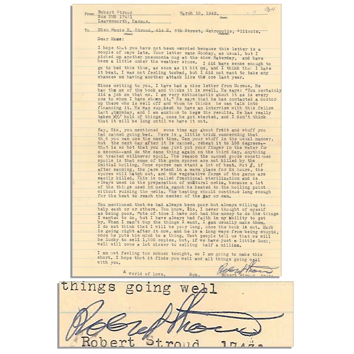 Canary breeder and violent criminal, the ''Bird Man of Alcatraz'' Robert Stroud typed letter signed. The 18 March 1942 dateline bears a Leavenworth prison address. Stroud's letter to his sister Mamie Stroud in Illinois reads in full, ''Dear Mame: I hope that you have not been worried because this letter is a couple of xays [sic] late. Your letter came Monday, as usual, but I picked up another pneumonia bug at the show Saterday, [sic] and have been a little under the weather since. I did have sense enough to go to bed this time, as soon as it hit me, and I think that I have it beat. I was not feeling too bad, but I did not want to take any chances on having another attack like the one last year. Since writing to you, I have had a nice letter from Marcus. He has the ms of the book and thinks its swell. He says: 'You certainly did a job on that ms. I am very enthusiastic about it as is every one to whom I have shown it.' He says that he has contacted a doctor up there who is well off and whom he thinks he can talk into financing it. He was supposed to have an interview with this fellow last Thursday, and I am anxious to hear the results. He has really taken hold of things, once he got started, and I don't think that it will be long until we have it out. Say, Sis, you mentioned some time ago about fruit and stuff you had canned going bad. Here is a little trick concerning that that you can use next time. Can your stuff in the usual manner, but the next day after it is canned, reheat it to 158 degrees -- that is so hot that you can just put your finger in the water for a second -- and do the same thing again on the third day. Anything so treated will never spoil. The reason the canned goods sometimes spoils is that some of the germ spores are not killed by the initial boiling. Some spores can stand a lot of heat. But, if after canning, the jars stand in a warm place for 24 hours, the spores will hatch out, and the vegetative forms of the germs are easily killed. This is called fractional sterilization and is always used in the preparation of cultural media because a lot of the things used in media canot [sic] be heated to the boiling point without ruining the media. The heating should continue long enough for the heat to reach the center of the jar or can. You mentioned that we had always been poor but always willing to help each or [sic] or others. You know, Sis, I never thought of myself as being poor. Lots of time I have not had the money to do the things I wanted to do, but I have always had faith in my ability to get by. When I can't buy the things I want, I can usually make them. I do not think that I will be poor long, once the book is out. Mark is going right after it now, and he is a long ways from being stupid, once he puts his mind to a thing. Most people tell us that we will be lucky to sell 1,500 copies, but, if we have just a little luck, well will come a lot closer to selling half a million. I am not feeling too robusk [sic] tonight, so I am going to make this short. I hope that it finds you well and all things going well with you. A world of love, Bob [signed] Robert Stroud''. Single page letter on a single sheet of ruled stationery measures approximately 8.5'' x 11''. Light toning and creasing, else near fine.