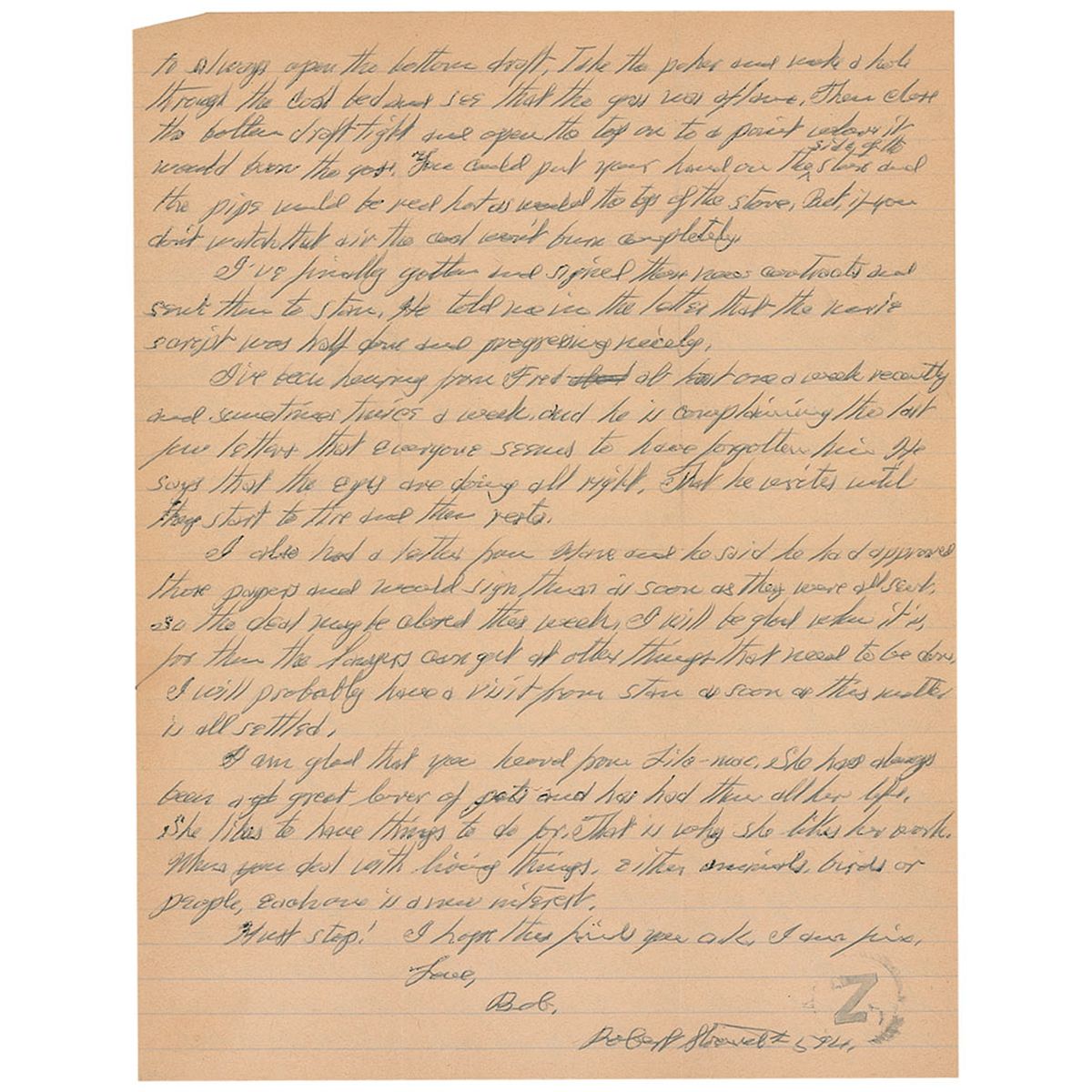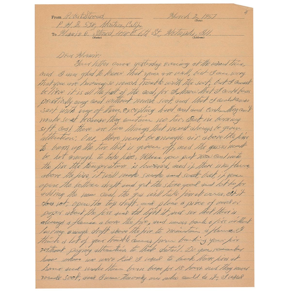ALS signed at the conclusion, “Bob, Robert Stroud, #594,” and once at the top, “Robert Stroud,” one page both sides, 8 x 10.25, lined paper, March 2, 1957. Stroud writes a lengthy letter to Mamie E. Stroud, who is having trouble with “soot” in her fireplace, explaining some of the essential mechanics involved in successfully maintaining a fire, “there needs to be enough air above the fire to burn up the tar that is given off,” then mentioning a movie script, “I’ve finally gotten and signed the new contracts and sent them to Stan. He told me in the letter that the movie script was half done and progressing nicely,” and finally ending with the curious and insightful line, “When you deal with living things, either animals, birds, or people, each one is a new interest.” In fine condition, with intersecting folds and uniform toning.