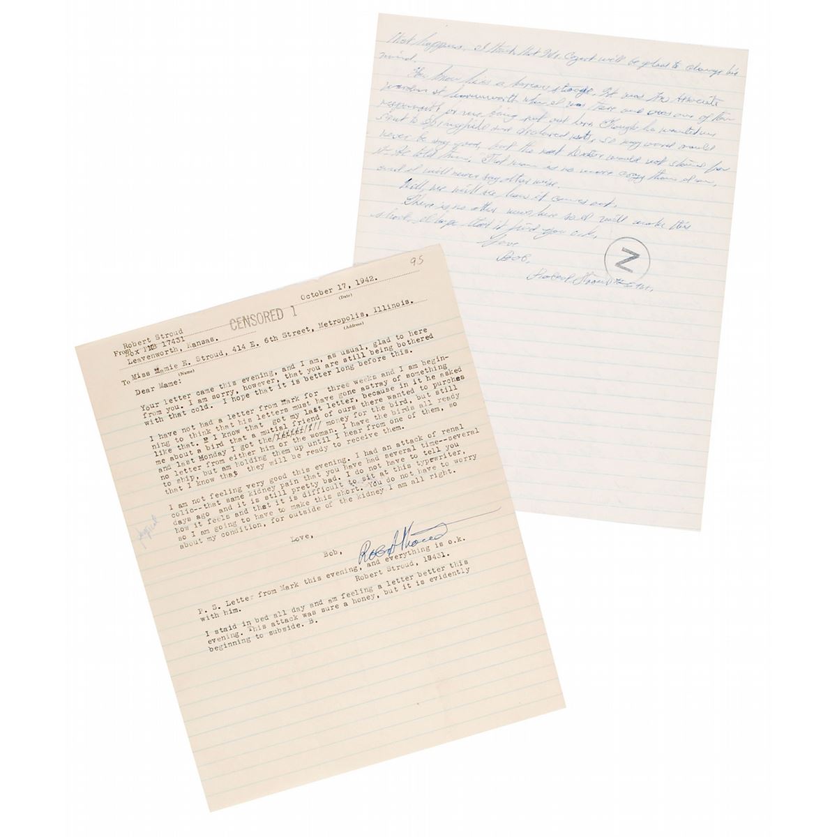 Notorious criminal (1890–1963) who, while imprisoned, became a self-educated authority on birds and earned the nickname ‘The Birdman of Alcatraz.’ Two letters: first, an ALS to Fred E. Daw, his longtime friend and president of the Chicago Bird Club, one page, lightly-lined both sides, 8 x 10.25, signed “Bob, Robert Stroud, #594,” December 21, 1958. The second, a TLS, one page, lightly-lined, 8 x 10.25, signed “Robert Stroud,” October 17, 1942. Letter to his sister Mamie E. Stroud, in part: “I have not had a letter from Mark for three weeks and I am beginning to think that his letters must have gone astray or something like that. I know that [he] got my last letter, because in it he asked me about a bird that a mutial [sic] friend of ours there wanted to purches [sic] and last Monday I got the money for the bird, but still no letter from either him or the woman. I have the birds all ready to ship, but am holding them up until I hear from one of them, so that I know that they will be ready to receive them.” In overall fine condition, with intersecting folds (one vertical fold passing through a single letter of each signature), some small tears and chips, and notations in an unknown hand.