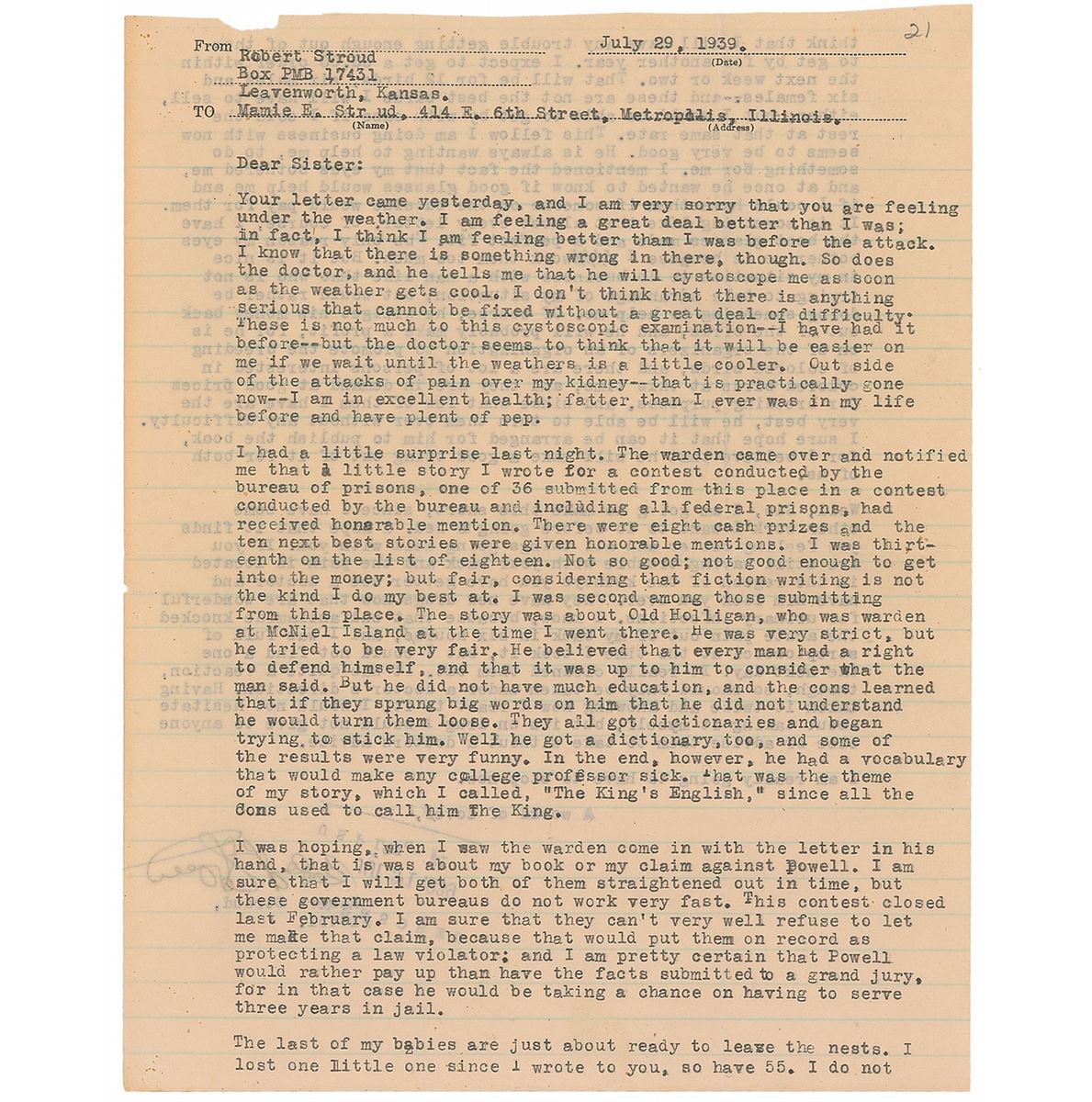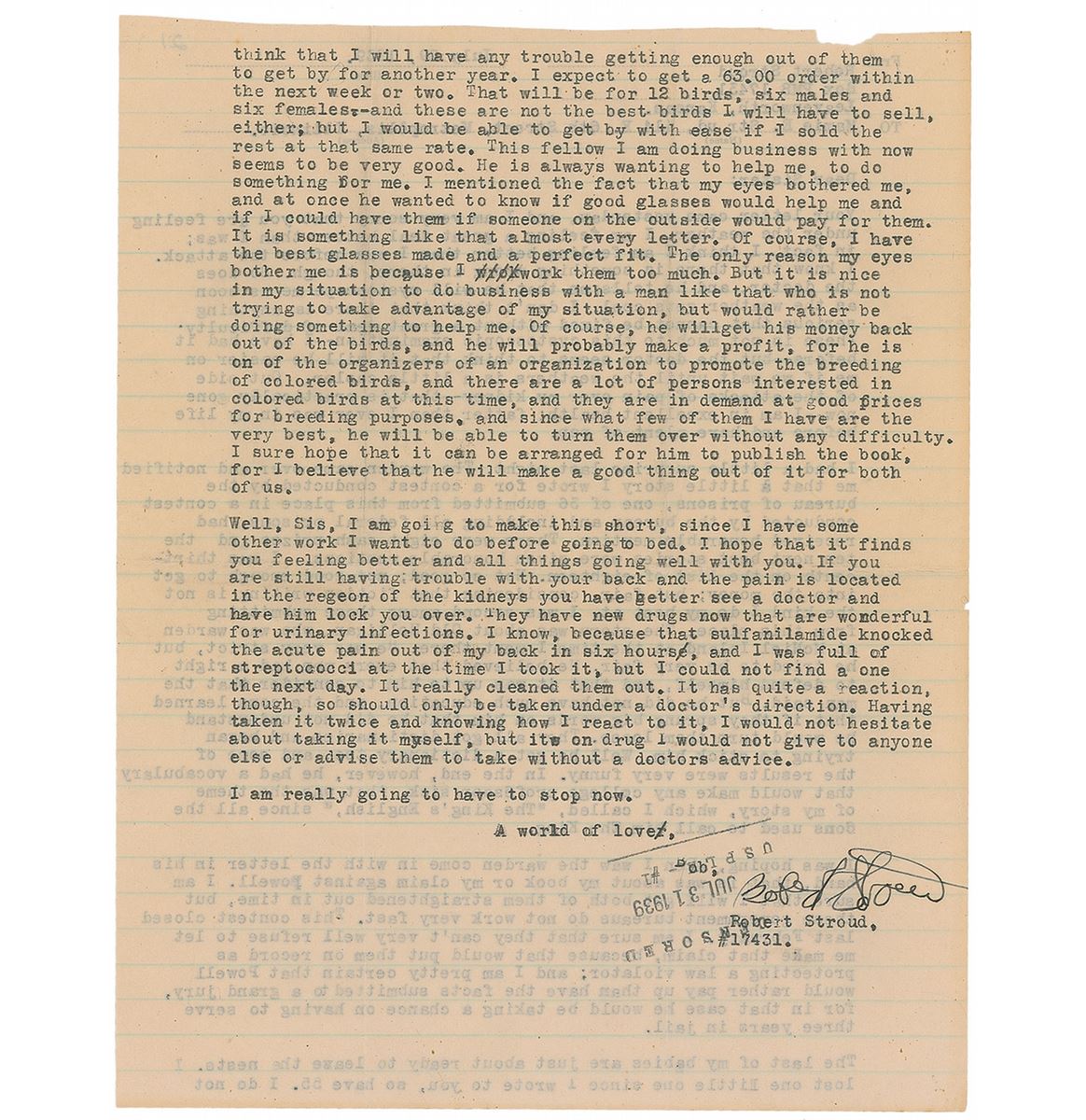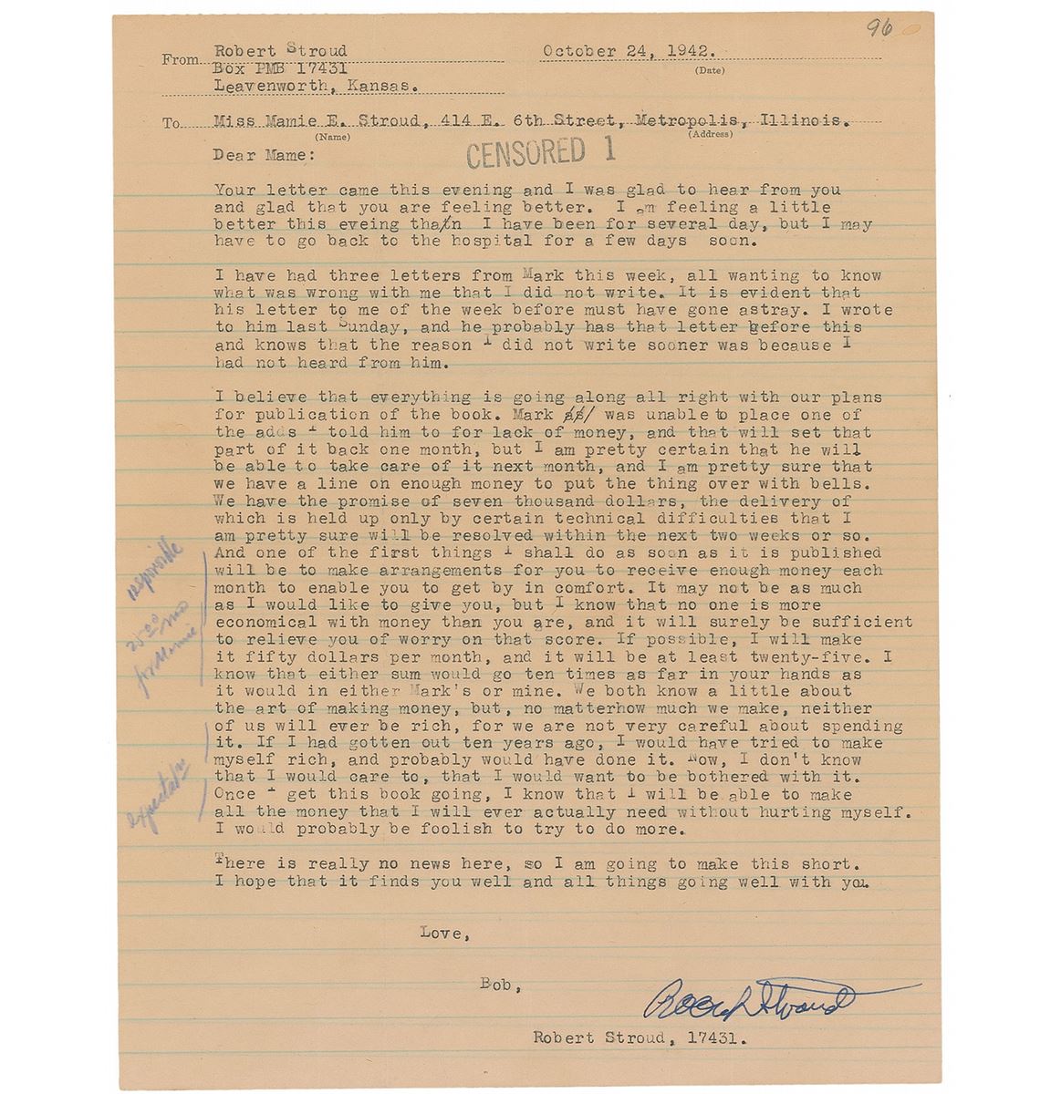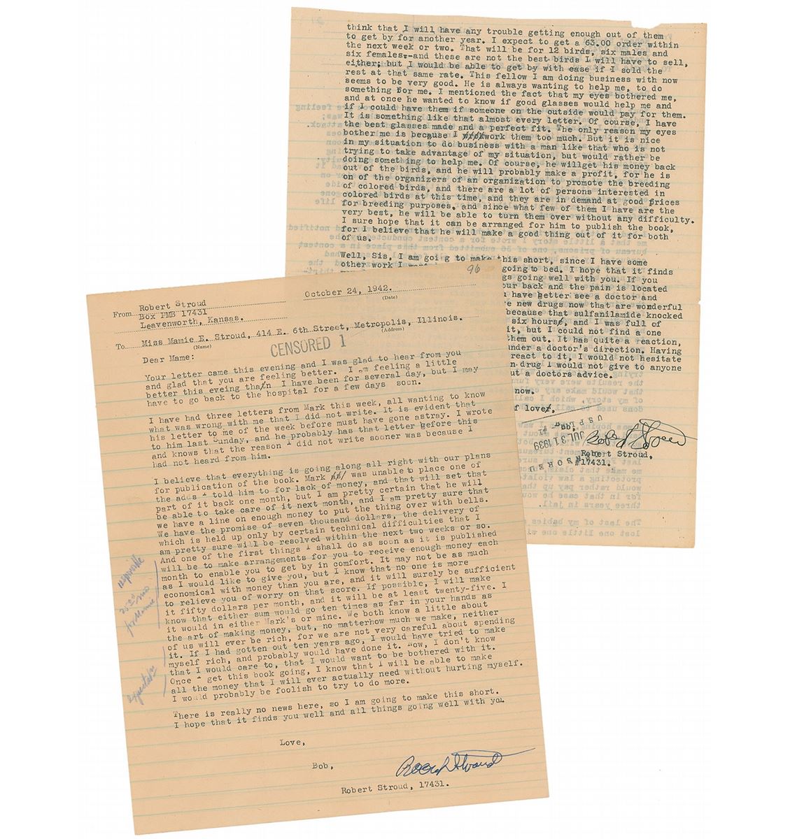 Two TLSs sent to his sister Mamie Stroud. The first, one page, lightly-lined, 8 x 10.25, October 24, 1942. The second, signed “Bob Stroud,” one page both sides, lightly-lined, 8 x 10, July 29, 1939, in part: “I had a little surprise last night. The warden came over and notified me that a little story I wrote for a contest conducted by the bureau of prisons, one of 36 submitted from this place…and including all federal prisons, had received honorable mention. There were eight cash prizes and the ten next best stories were given honorable mentions. I was thirteenth on the list of eighteen. Not so good; not good enough to get into the money; but fair, considering that fiction writing is not the kind I do my best at.” The December letter bears blue pencil notations in another hand. In overall fine condition, with intersecting folds to both, and tiny tears to left edge and a chip to trimmed top edge of the July letter.
